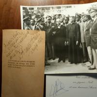 1898-1981, Schriftsteller - 8 Autographen: 1. Kl. 4°-Blatt mit e. Zitat, U. und D. 18.11.1930. "Was wir litten, haben wir für eine Idee ertragen!". 2. Blatt aus dems. Album mit U. und D. "nach den Tagen des polnischen Krieges" 20.10.1939 (Kopierstift). 3. Pfo. (in Wehrmachts-Uniform) mit U., mont. 4. 2 Kärtchen mit U., eines mit D. 10.11.1951. 5. Brief mit U., (Briefkopf Seeg, Allgäu) 19.5.1953. Bittet, "mit meinem kleinen Beitrag zufrieden zu sein...". 6. Brief mit U., (Seeg 24.9.1970), ¾ S. 4°, gel. An die "Arbeitsgemeinschaft für Werbung": Will gerne zur Urkundenverleihung kommen u.a. 7. Karte mit e. Gruß, U. und Jahr 1975.