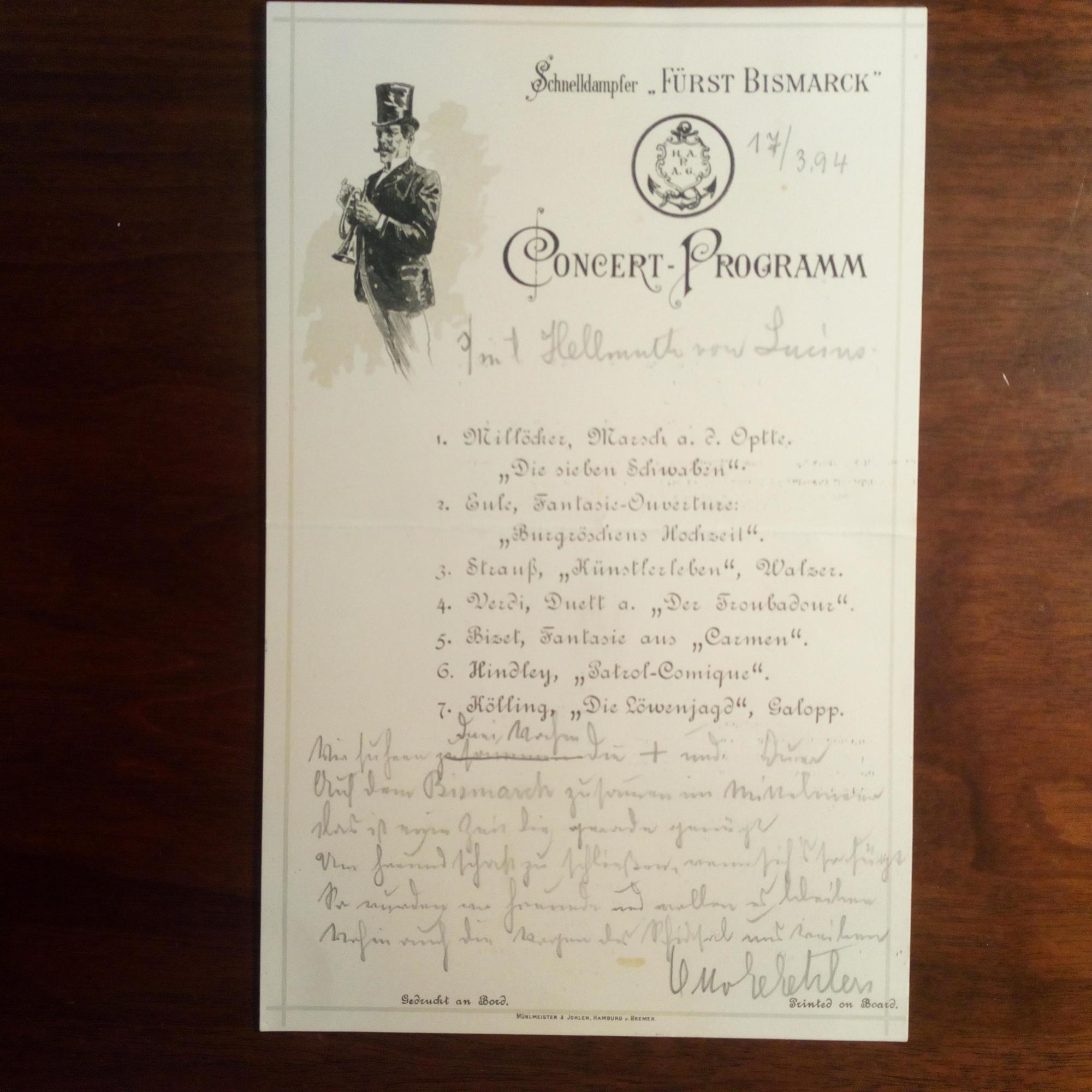 1855-95 (ermordet), Forschungsreisender und Reise-schriftsteller - Hübsches "Concert-Programm" ("Mit Hellmuth von Lucino"), 17.3.1894, an Bord des Dampfers "Fürst Bismarck" im Mittel-meer. Darauf e. witziges Gedicht (6 Z.) u. U., Bleistift. Selten.