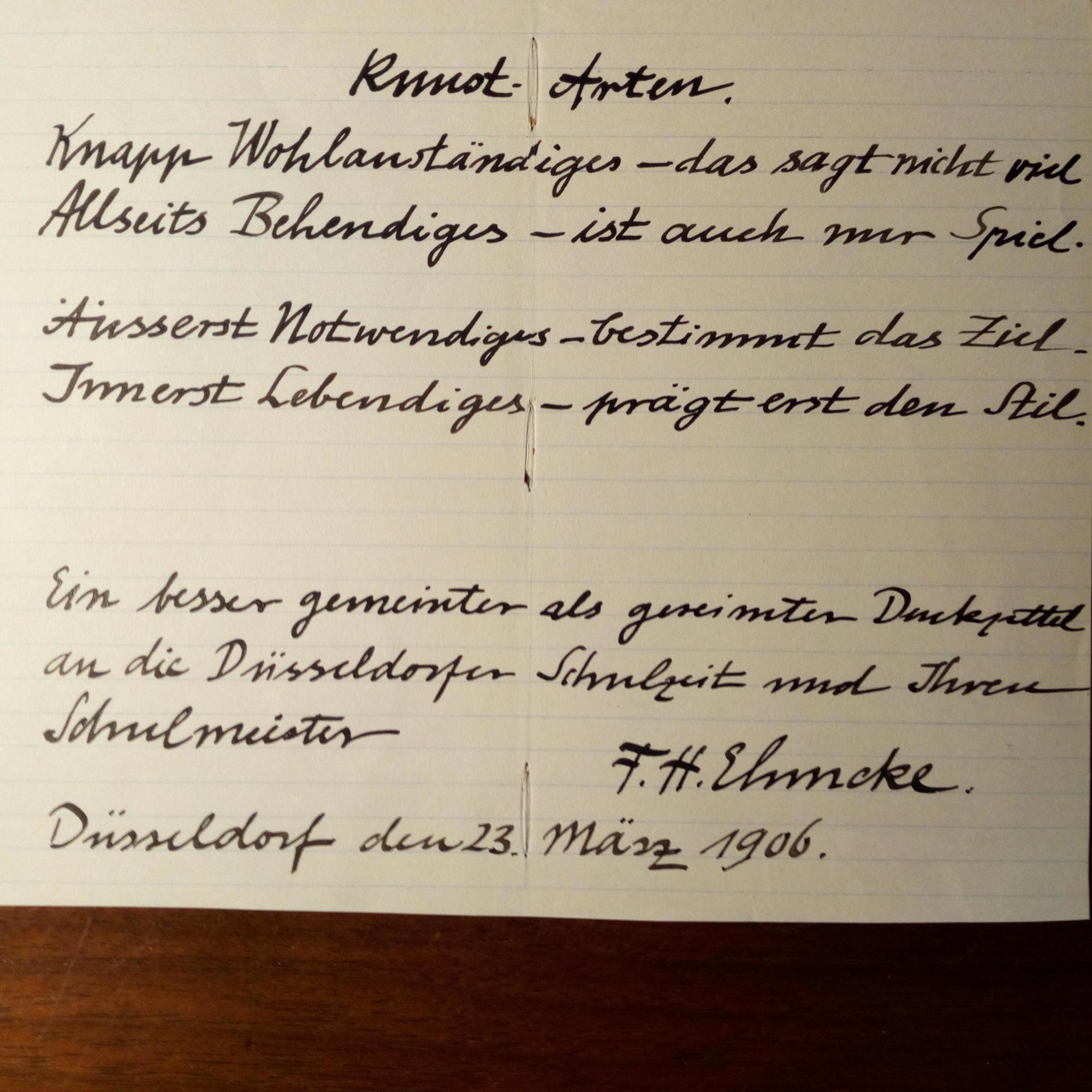 1878-1965, Graphiker und Schriftgestalter - 8°quer-Blatt mit e. Zitat, Widm. und U., Düsseldorf 23.3.1906. "Ein besser gemeinter als gereimter Denkzettel an die Düsseldorfer Schulzeit...".