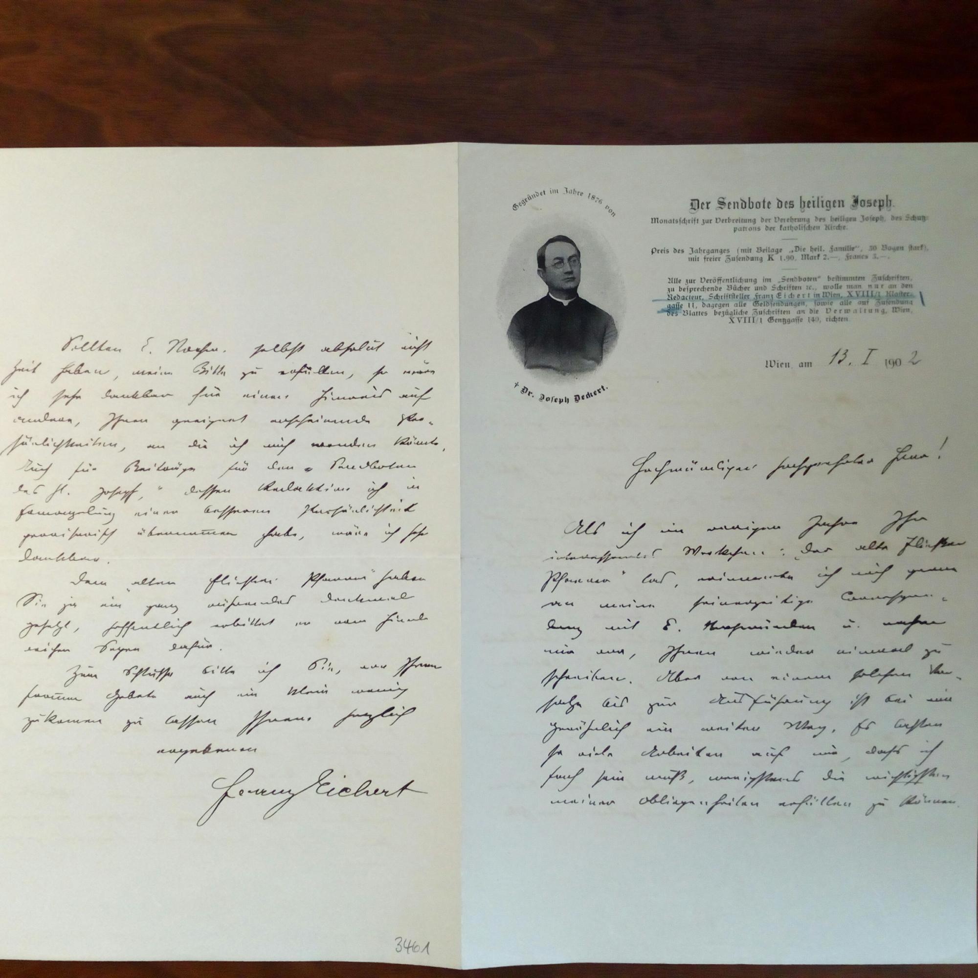 1857-1926, österr. Pfarrer und Publizist - E. Brief mit U., (Wien) 13.1.1902, 4 S. gr. 8°, Kopf als Red. des "Sendboten des hl. Josef". Wohl an den dän. Pfarrer und Schriftsteller Jakob Knudsen (1858-1917): Will ihn zur Mitarbeit beim "Volksblatt" gewinnen.