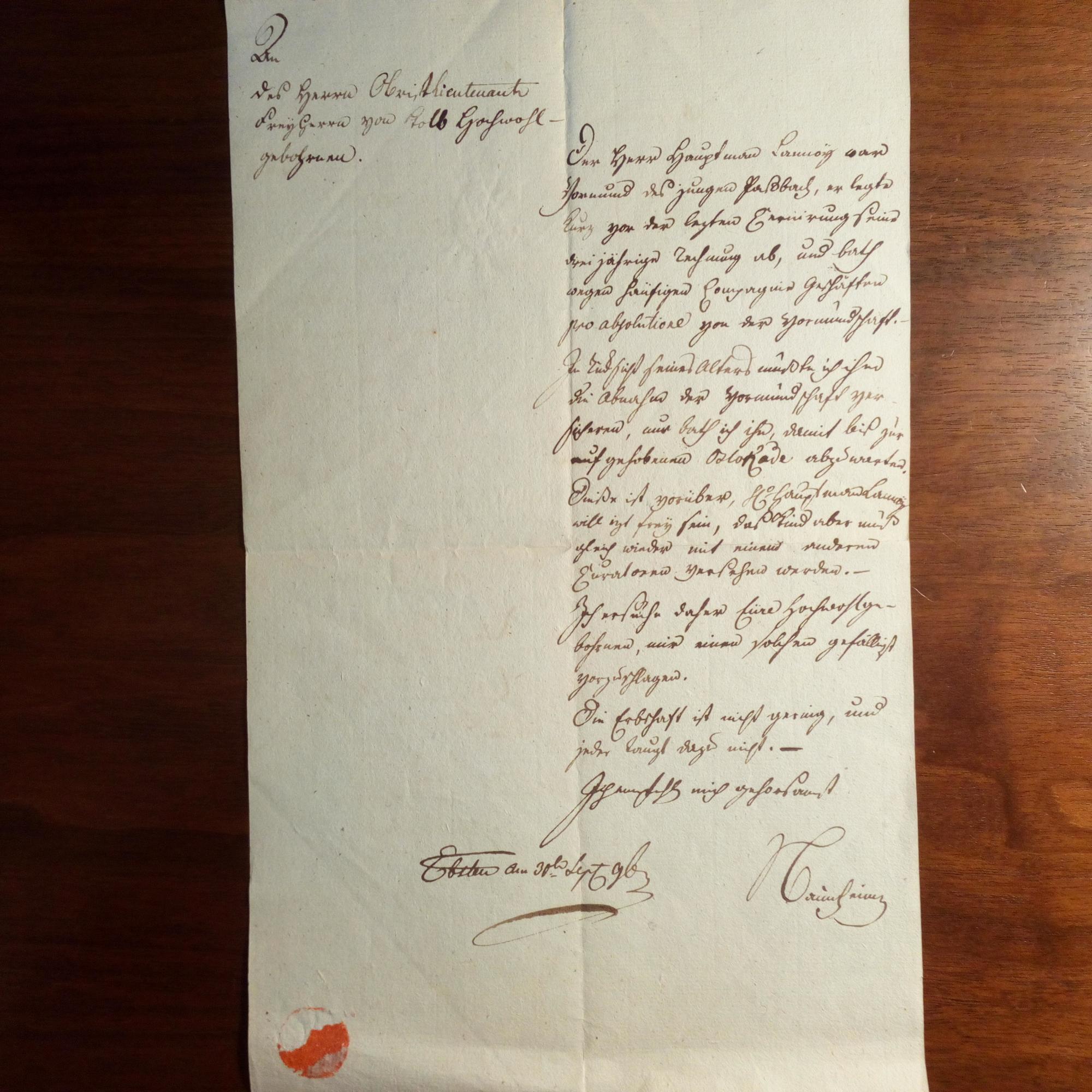 Amtl. Schreiben mit U. des Rechtsanwalts Niklas Naunheim, Ehrenbreitstein, 30.9.1796, 1 S. folio, Siegelspur. An Oberleutnant von Stolb betr. "des jungen Paßbach", dessen Vormund ursprüngl. der frz. Hauptmann Charles de Lannoy war: ...In Rücksicht seines Alters mußte ich ihm die Abnahme der Vormundschaft versprechen, nur bath ich ihn, damit bis zur aufgehobenen Blockade (der preuß. Festung durch die frz. Armee) abzuwarten. Diese ist vorüber...Die Erbschaft ist nicht gering, und jeder taugt dazu nicht...