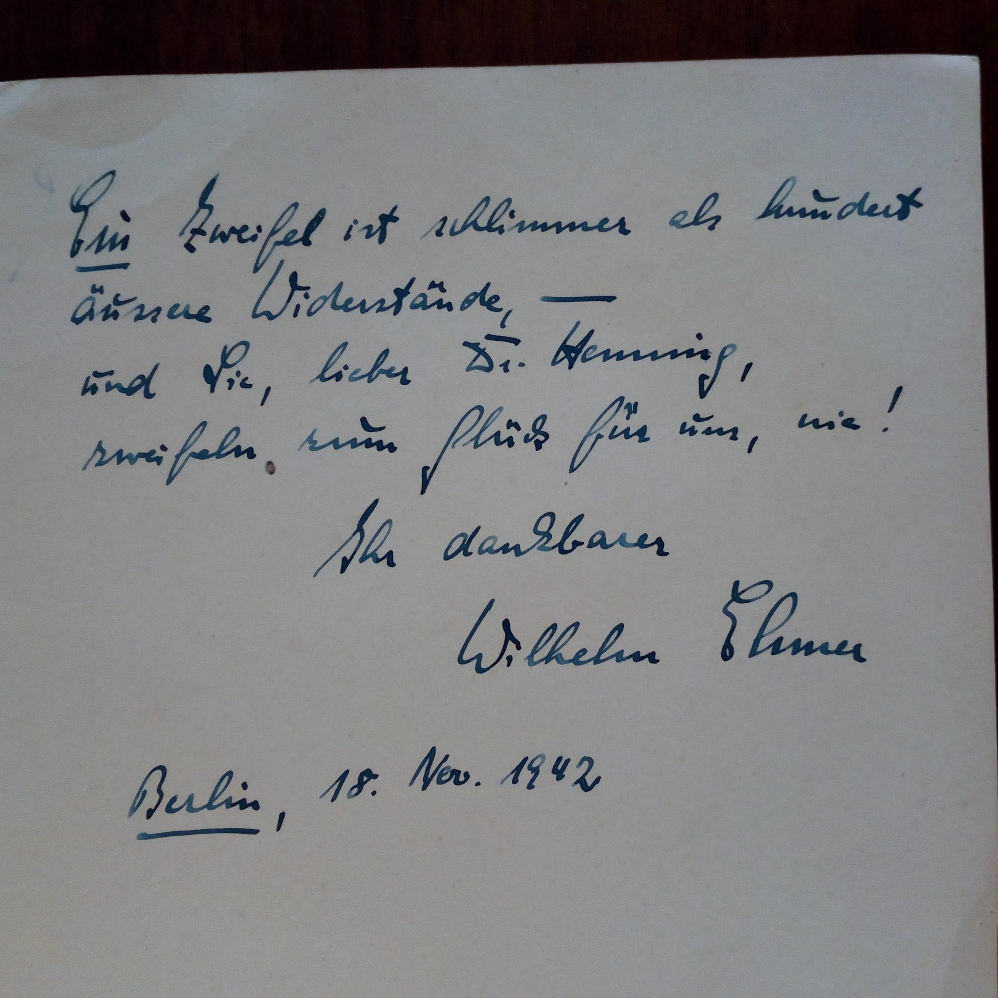 1896-1976, Schriftsteller und Verleger - 4°-Blatt mit e. Zitat, Widm. (für Dr. Henning) mit U., Berlin 18.11.1942. Auf Rückseite längere Einträge mit U. des Schauspielers Mathias Wiemann (1902-69) und des Schriftstellers Wilhelm Schäfer (1868-1952).