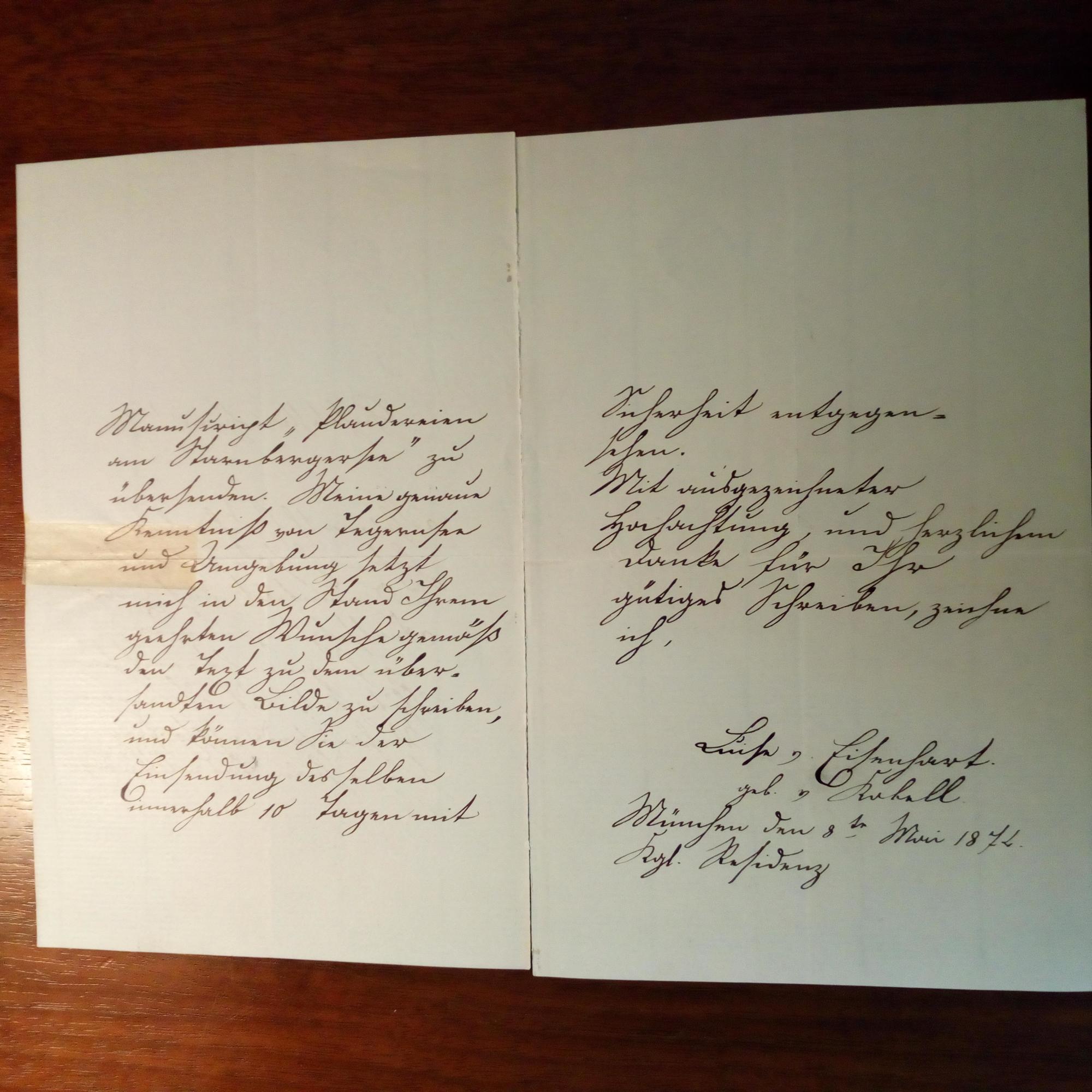 geb. von Kobell, 1827-1901, verh. mit dem Kabinettssekretär von König Ludwig II., August von E., Schriftstellerin und Salonniere, Freundin u.a. von Scheffel - E. Brief mit U., München, Kgl. Residenz 8.5.1872, 3 S. 8°, Klebeband-Stellen. Bedankt sich für den Auftrag, den Text zu einem Bild zu schreiben. Beiliegen: E. Zitat und U., 1 S. 8° ...Die Philosophie hängt vielfach von Gesundheit und Glück ab...", und: E. Manuskript mit U. am Kopf, 1 S. folio, dicht geschr. ("Aus dem Artikel Regierung, Sitten und Gebräuche unter der Königin Elisabeth von England").