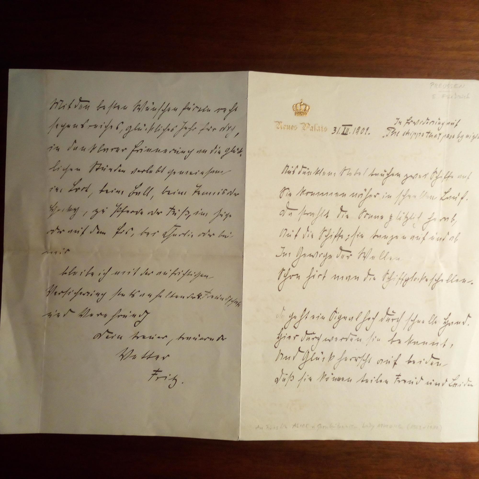 1883-1942, Prinz (2. Sohn von Kaiser Wilhelm II.), General - E. Brief mit U., golden gepr. Emblem "Neues Palais", 31.12.1909, 4 S. 8°, kl. Gebr.spuren. An Prinzessin Alice von Großbritannien (1883-1981, Enkelin von Queen Victoria, spät. Countess of Athlone) - E. Gedicht ...In Erwiderung auf "The shipps that pass by night" (von Henry W. Longfellow): Aus dunklem Nebel tauchen zwei Schiffe auf/ Sie kommen näher in schnellem Lauf... (36 Z.). Auf letzter Seite ausführl. Neujahrsgrüße "in Erinnerung an die glücklichen Stunden verlebt gemeinsam im Boot, beim Ball...zu Pferde oder zu Fuß...oder auf dem Eis...Dein treuer, trauernder Vetter Fritz...