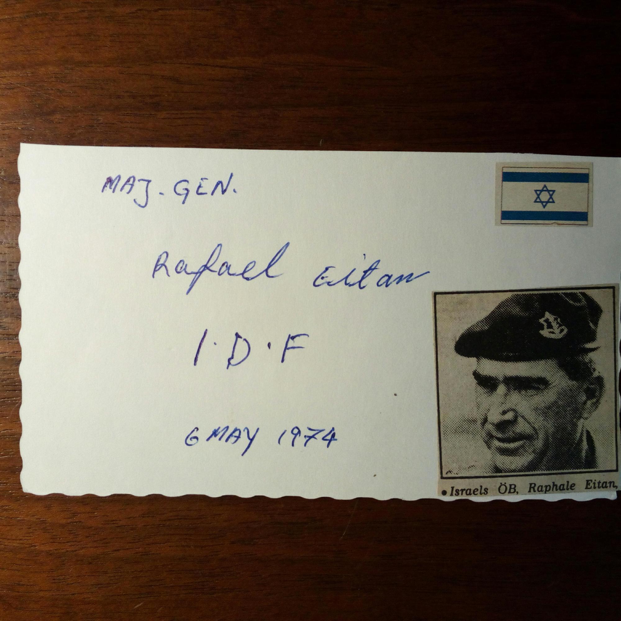 1929-2004, israel. Generalstabschef und Politiker - Kärtchen mit kl. mont. Druck-Pfo. (aus Zeitung, in Uniform) mit U. und e. kl. Zusätzen. 6.5.1974. Mont.spuren auf Rückseite.