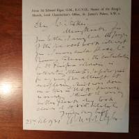 1857-1934, brit. Komponist - E. Brief mit U., (Lord Chamberlain`s Office, London) 23.2.1931, 1 S. 4°, Briefkopf, mit e. postal. Umschlag. An einen Kolumnisten des "Berrow's Worcester Journal" betr. biograph. Angaben für einen Artikel: ...I never could plave Mr. Thomas Calosse: the 'contribution' für the Fairfax soldiers is interesting I think: I apologise for my very own attempt of deciphering which was done on a tour in USA. I never revised...