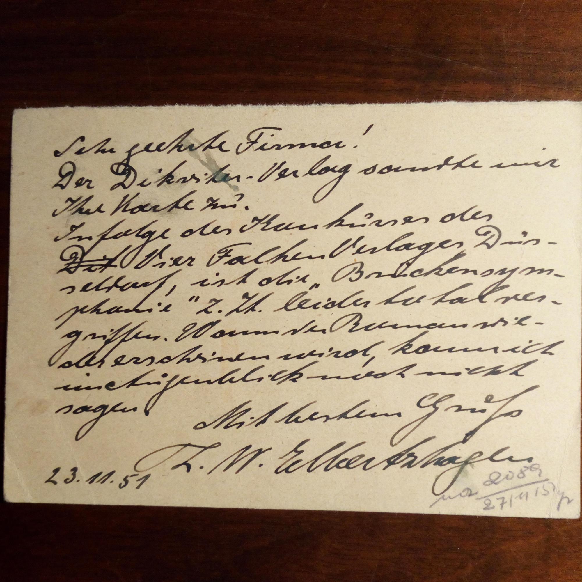 1888-1967, Schriftsteller - E. postal. Postkarte m. U. (Überlingen) 23.11.1951, kl. Wasserspur, Abs.-stempel, Bearb.vermerk. An die Buchhandlung Böhringer in Wunsiedel: ...ist die "Brückensymphonie" z.Zt. leider total vergriffen...