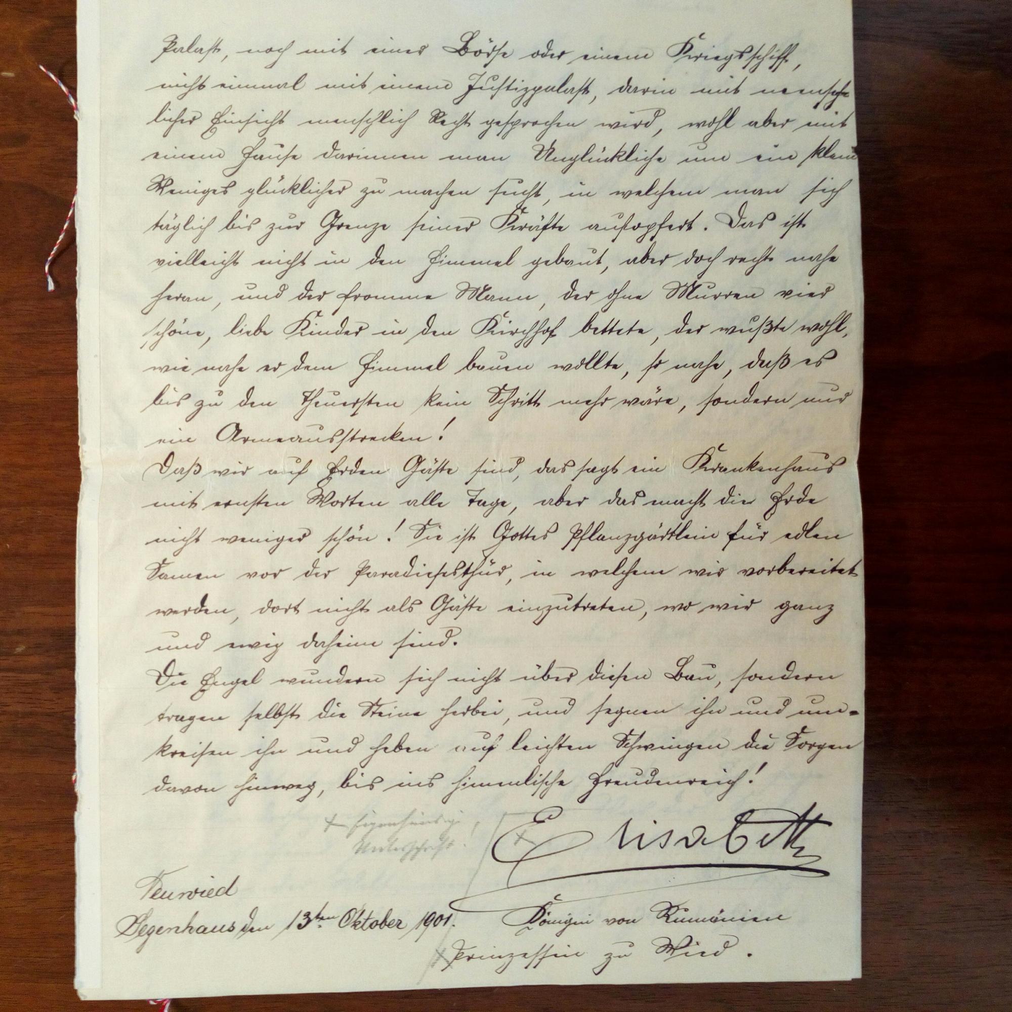1843-1916, als Gattin von Karl I. Königin von Rumänien, Pazifistin und Schriftstellerin (Pseud. "Carmen Sylva") - Vollständiges Manuskript (Schreiber-Reinschrift) ihrer Rede zur Einweihung der Klinik "Ottohaus" (nach dem verstorbenen Bruder, eine Stiftung ihrer Mutter, Fürstin Marie von Wied), mit e. U., Neuwied "Segenhaus" 13.10. 1901, 10 S. 4°, Kordel-Heftung (etw. gelockert).