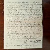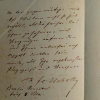 1791-1872, Schriftsteller - E. Br. m. U., Hohenberg am Würmsee (bei Starnberg) 11.8.1861, 3 S. gr. 8°, kl. Schrift, Klammerspur, mit Fragment des e. postal. Umschlags. An Hensel in Solingen. Seit seiner Rückkehr von Berlin von einer "ununterbrochenen Kette von Anfällen, Widerwärtigkeiten und dringenden Geschäften heimgesucht", will er einen Fototermin verschieben. Beiliegt kl. e. Faltbr (2 S. kl.8°, Siegelrest) und Fragment eines e. postal. Umschlags.