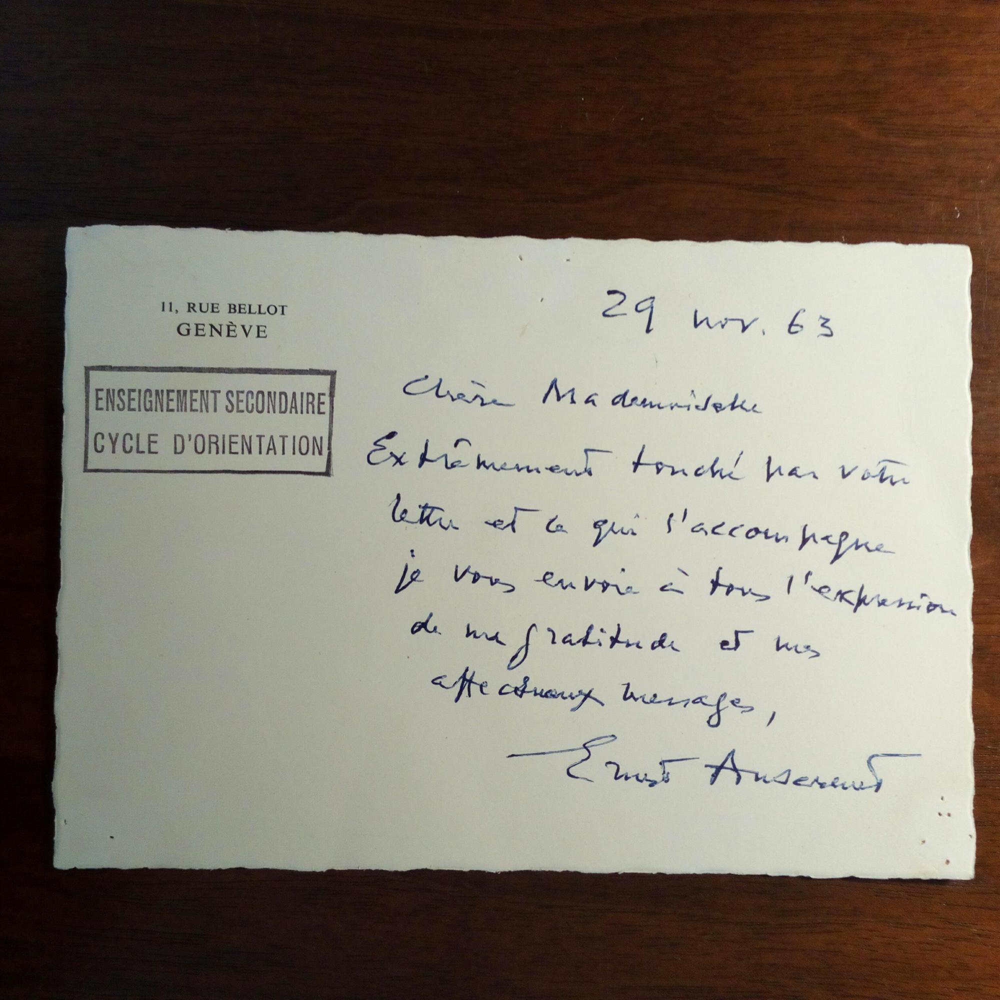 1883-1969, schweiz. Dirigent - E. Briefkarte mit U., 29.11.1963, 1 S., Adr.briefkopf, mit e. postal. Umschlag (U. im Abs.). An Martine Jacques-Delaroge, Eingangsstempel des "Cycle d'Orientation" in Genf. ...Extrèmement touché par votre lettre et qui accompagne...