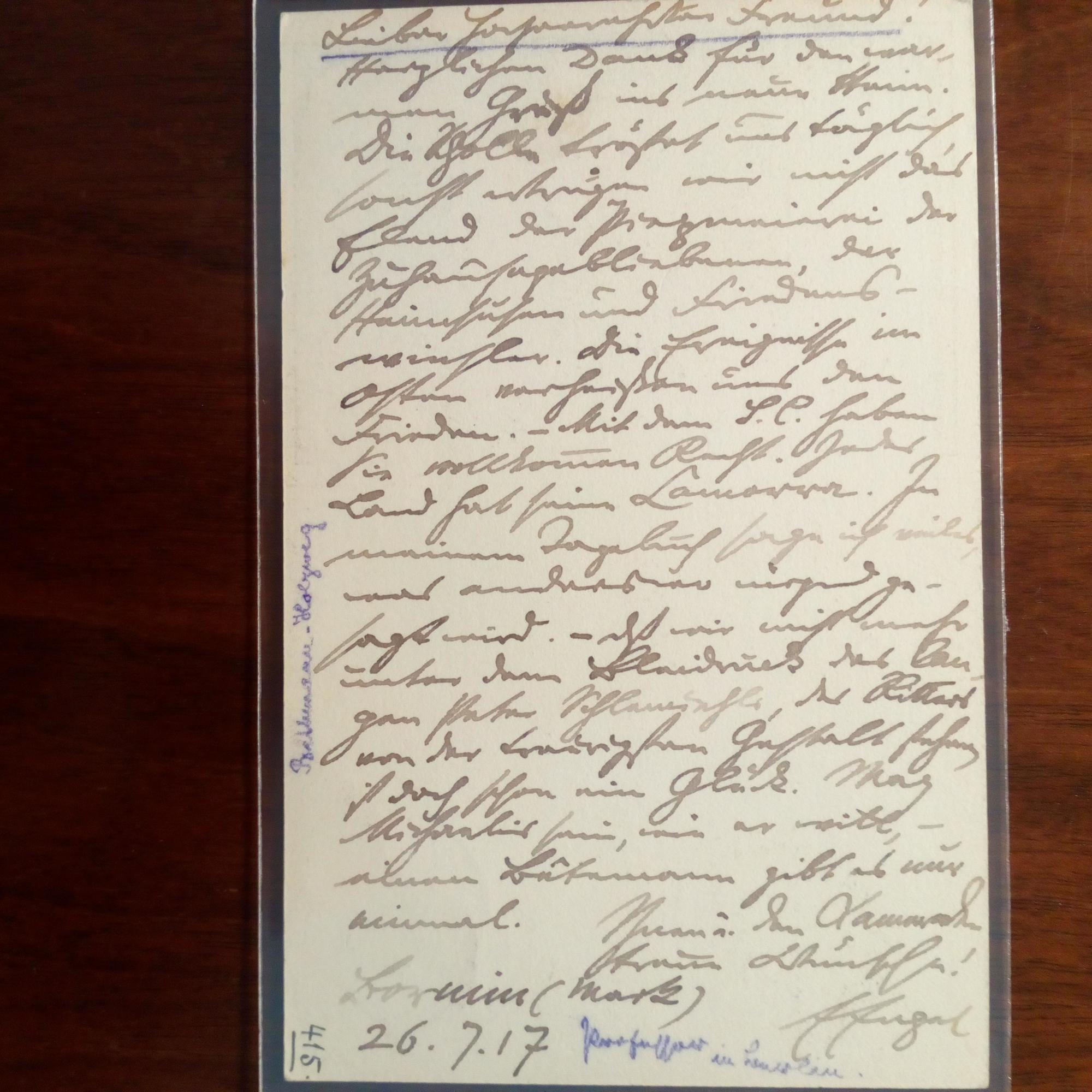 1851-1938, Philologe und Literaturwiss. - 2 e. postal. Postkarten (mit Werbung für sein "Tagebuch 1914-15") mit U. Feldpost. An Rechtsanwalt Franz Meuser: Berlin 10.6.1917: Über die großen Erfolge seines Buches/ und Bornim (sein Geburtsort bei Potsdam), 26.7.1917: Dankt ausführl. für Grüße. ...Die Scholle tröstet uns täglich, sonst ertrügen wir nicht das Elend...der Zurückgebliebenen, der Heimsusen und Friedenswinsler. Die Ereignisse im Osten verheißen uns den Frieden...Jedes Land hat seine Camorra...