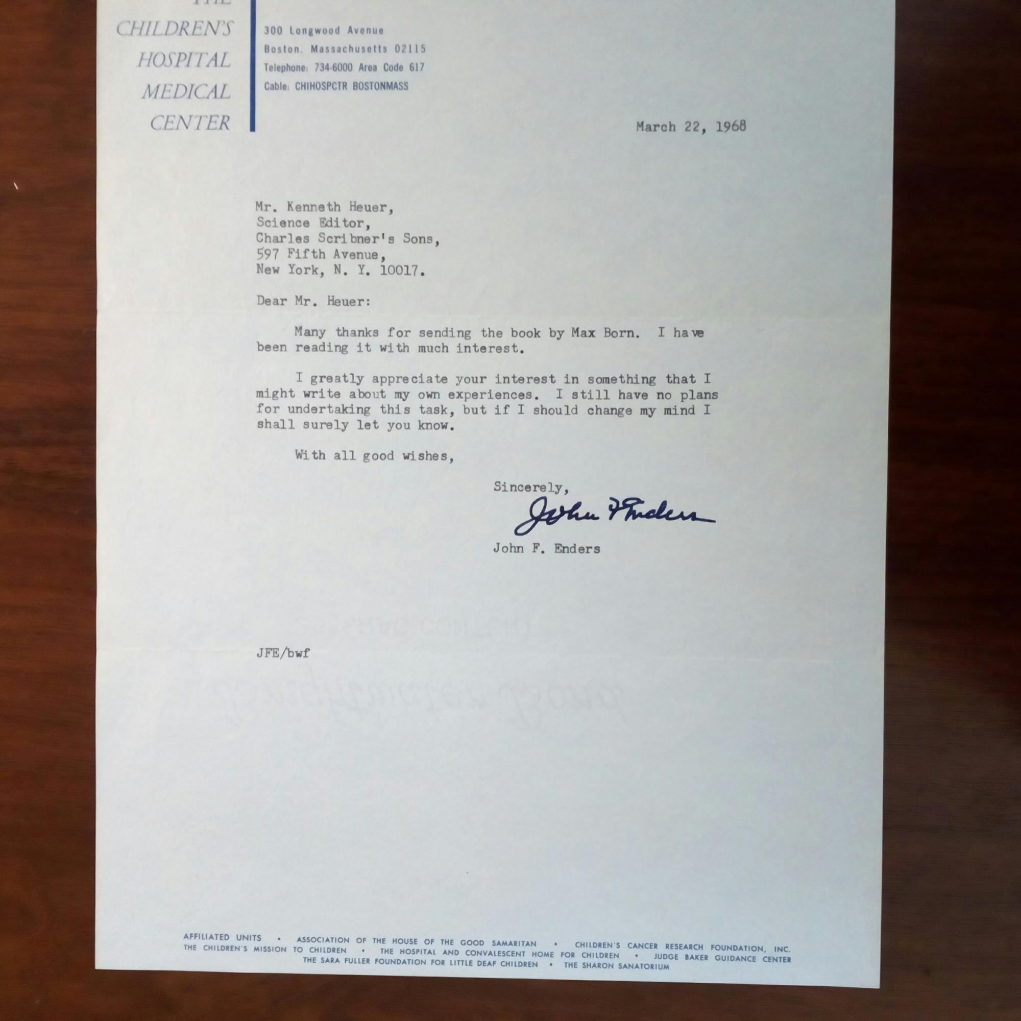 1897-1985, US-Bakteriologe - Brief mit U., (Boston) 22.3.1968, ¾ S. 4°. Kopf des "Children's Hospital Medical Center". Dankt dem Astronomen und Wissensch.publizisten Kenneth Heuer (geb. 1927) in New York für ein Buch von Max Born. ...I greatly appreciate your interest in something that I might write about my own experiences...