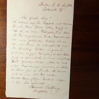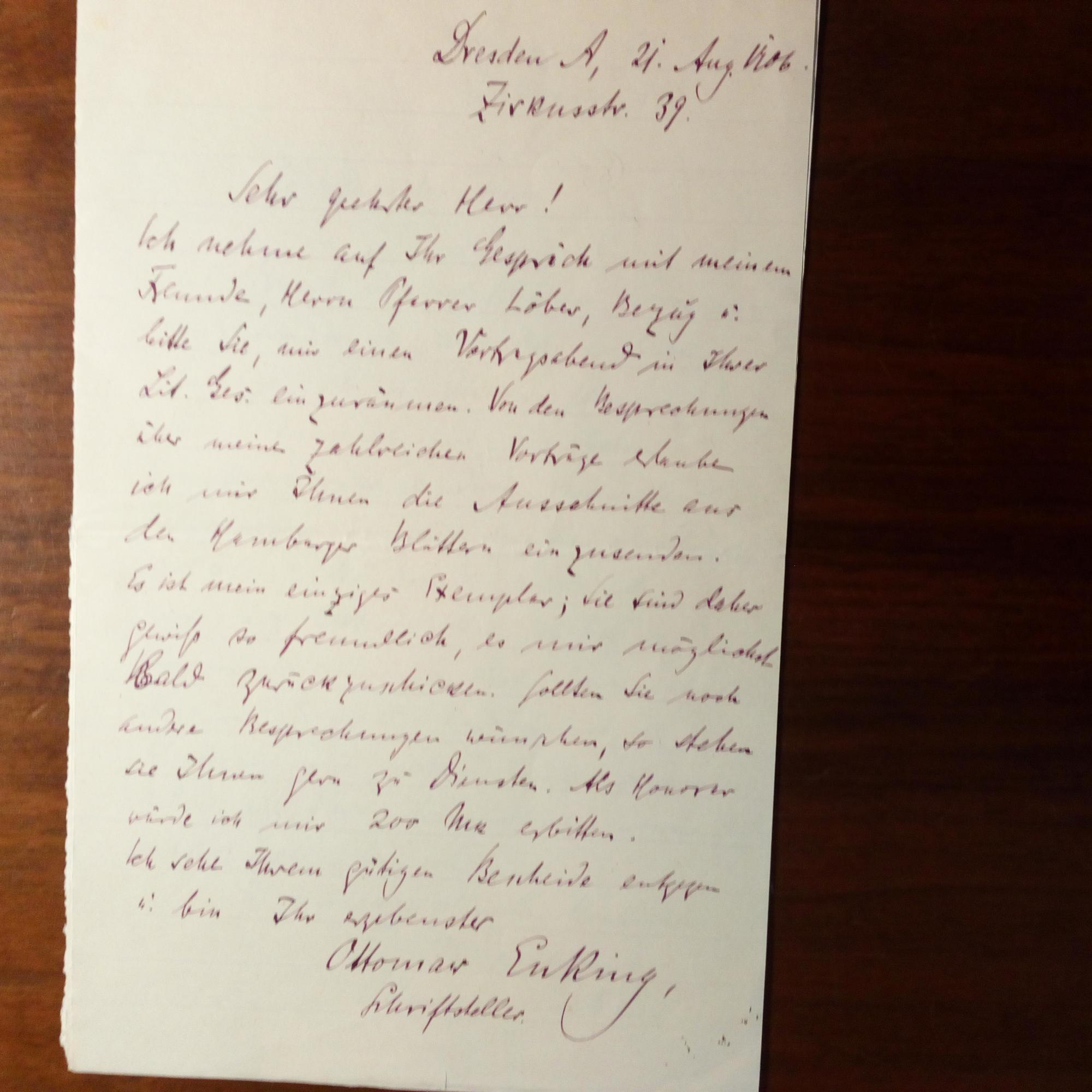 1867-1945, Schriftsteller - 7 e. Briefe, zus. ca. 7 ½ S. 8°, Pfo. als e. Karte und 5 e. postal. Postkarten, alle mit U., Dresden 1906-11, teilw. kl. Gebr.spuren. An Lehrer Ehringhaus, Prof. Thimme und Prof. Overmann in Erfurt betr. Lesungen. Beiliegen: E. postal. Postkarte mit e. Gedicht und 3 U. von einer Lesung 1906, Bleistift, sowie e. postal. Postkarte (Dankesz.) mit U. und D. (Dresden) 1932. (zus. 15 Autographen).