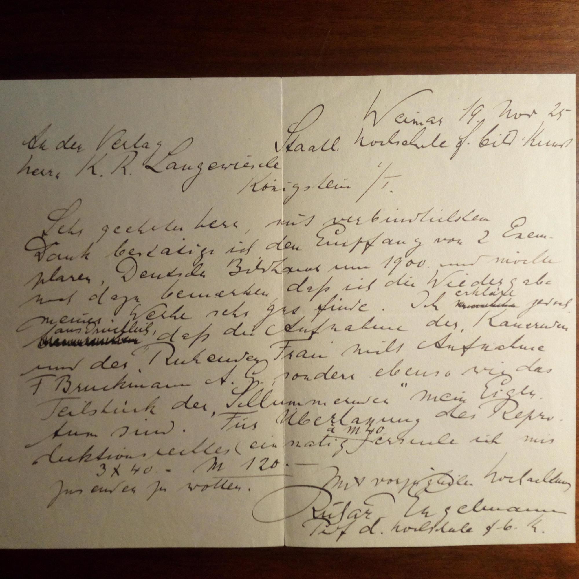 1868-1966, Bildhauer - E. Brief mit U., Kunsthochschule Weimar 19.11.1925, 1 S. gr. 4°. An den Kunstbuch-Verleger Karl Robert Langewiesche (1877-1949) in Königstein (Taunus): Dankt für das Buch "Deutsche Bildhauer um 1900": ...daß ich die Wiedergabe meiner Werke sehr gut finde... Und bittet um das Honorar ("3x40= M 120,-"). Beiliegt ähnl. Brief an dens.: Staatl. Kunstschule Weimar 28.91926, 1 S. 4°quer. ...ich Ihnen selbstverständlich das Recht für alle Auflagen gewähre...