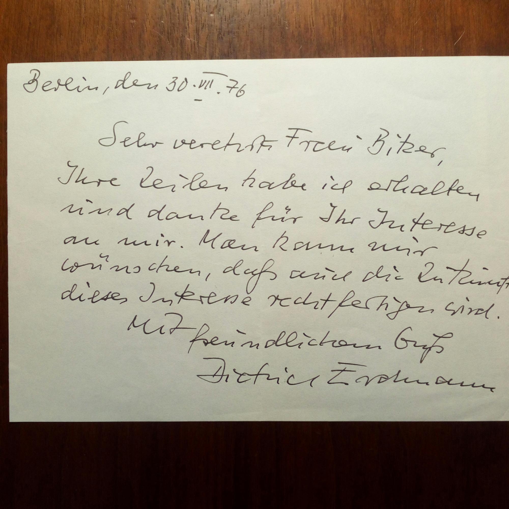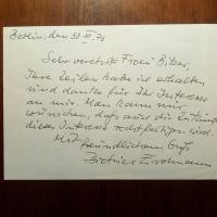 1917-2009, Komponist - E. Brief mit U., Berlin 30.7.1976, 1 S. 8°quer, mit postal. Umschlag. An eine Sammlerin.
