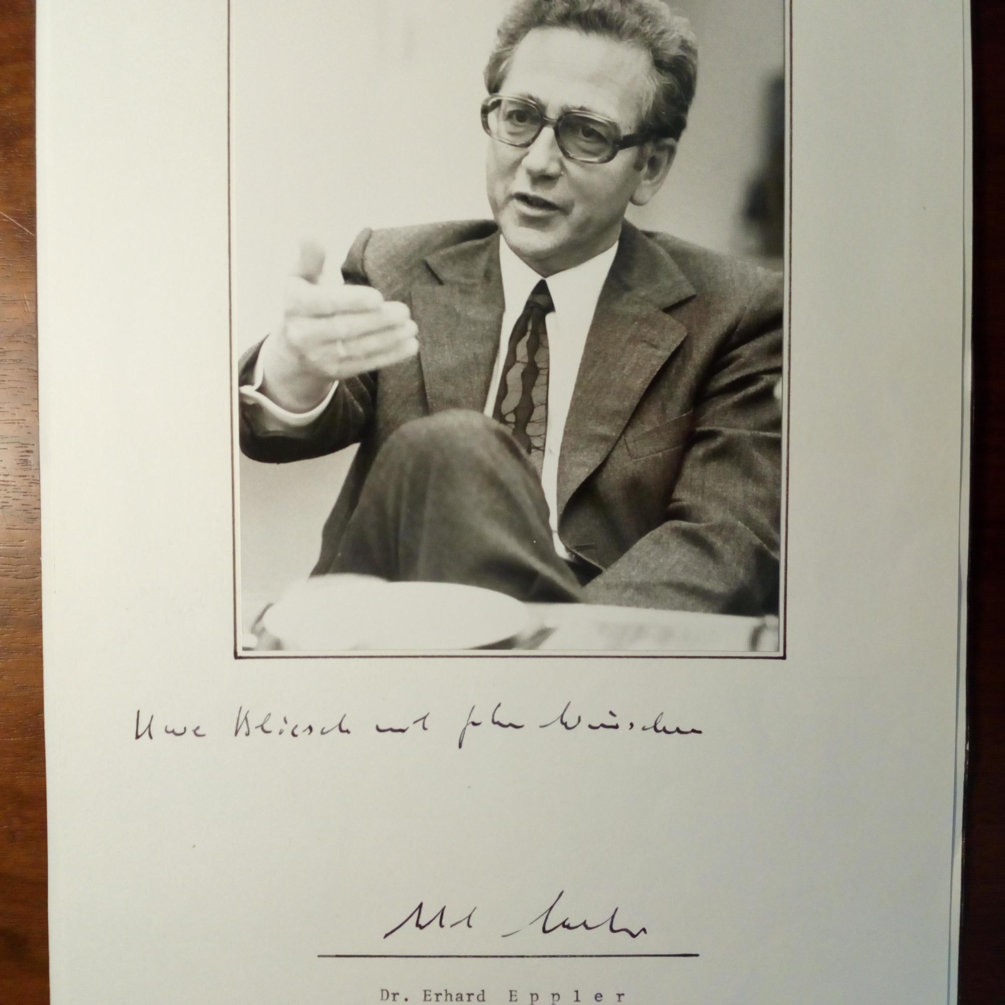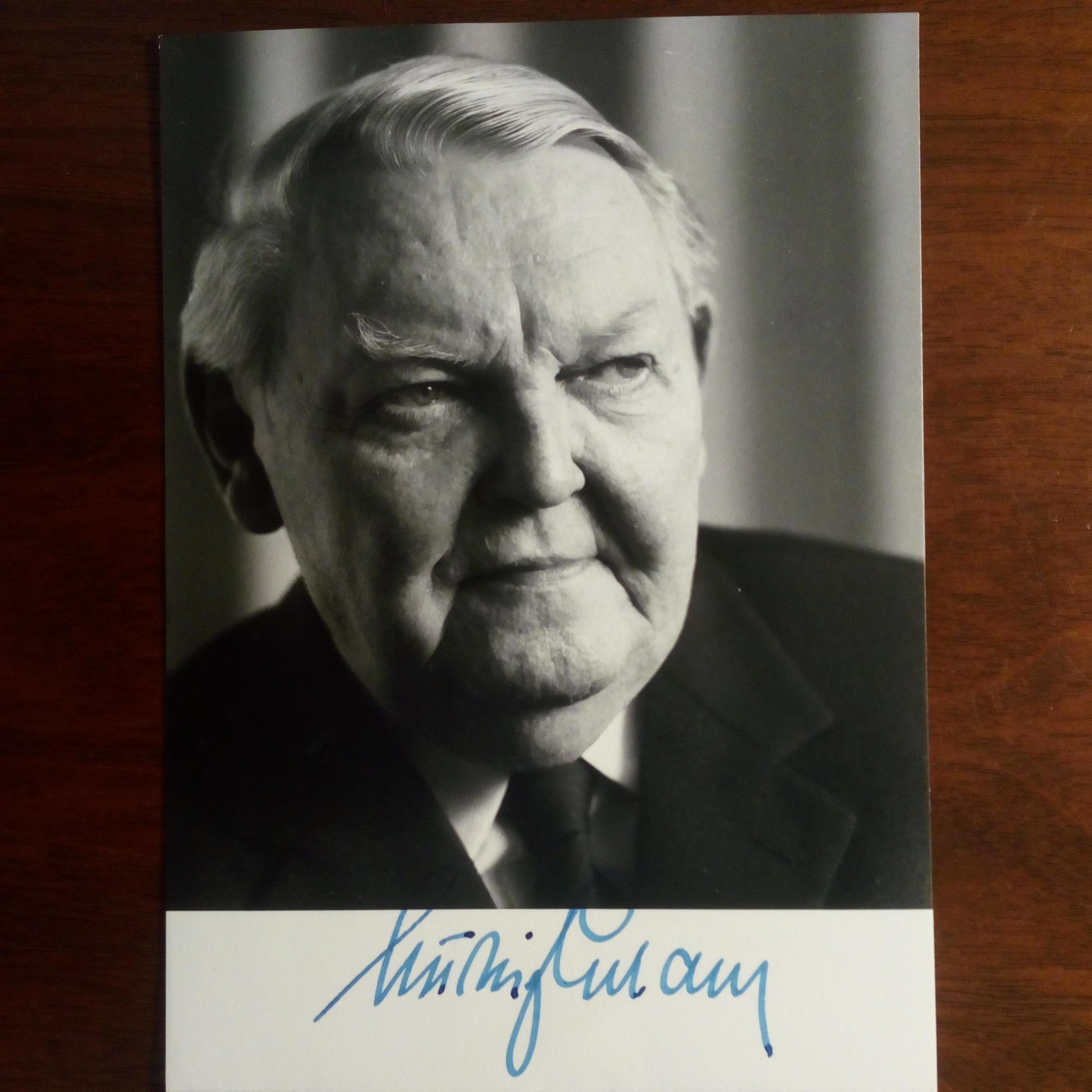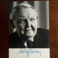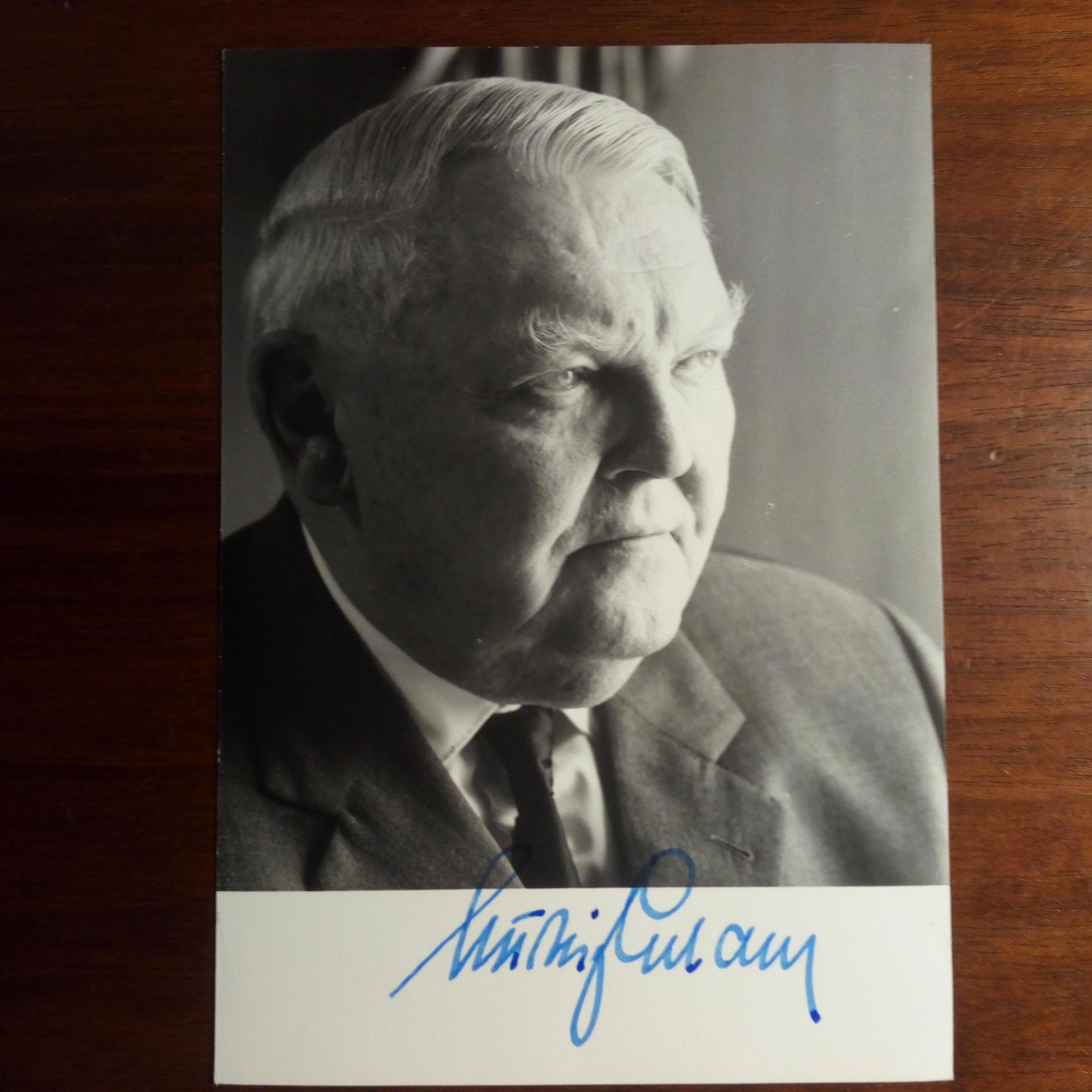 1926-2019, Politiker (SPD) und Friedens-Aktivist - Widm. und U. unter auf 4° mont. Pfo. (Hochglanz, ca. 8°). Beiliegen 2 Pfo. mit U., die Broschüre "Deshalb bin ich Sozialdemokrat", auf Titel (mit Pfo.) Widm. mit U. (1973) und FDC mit U. (5 Autographen).