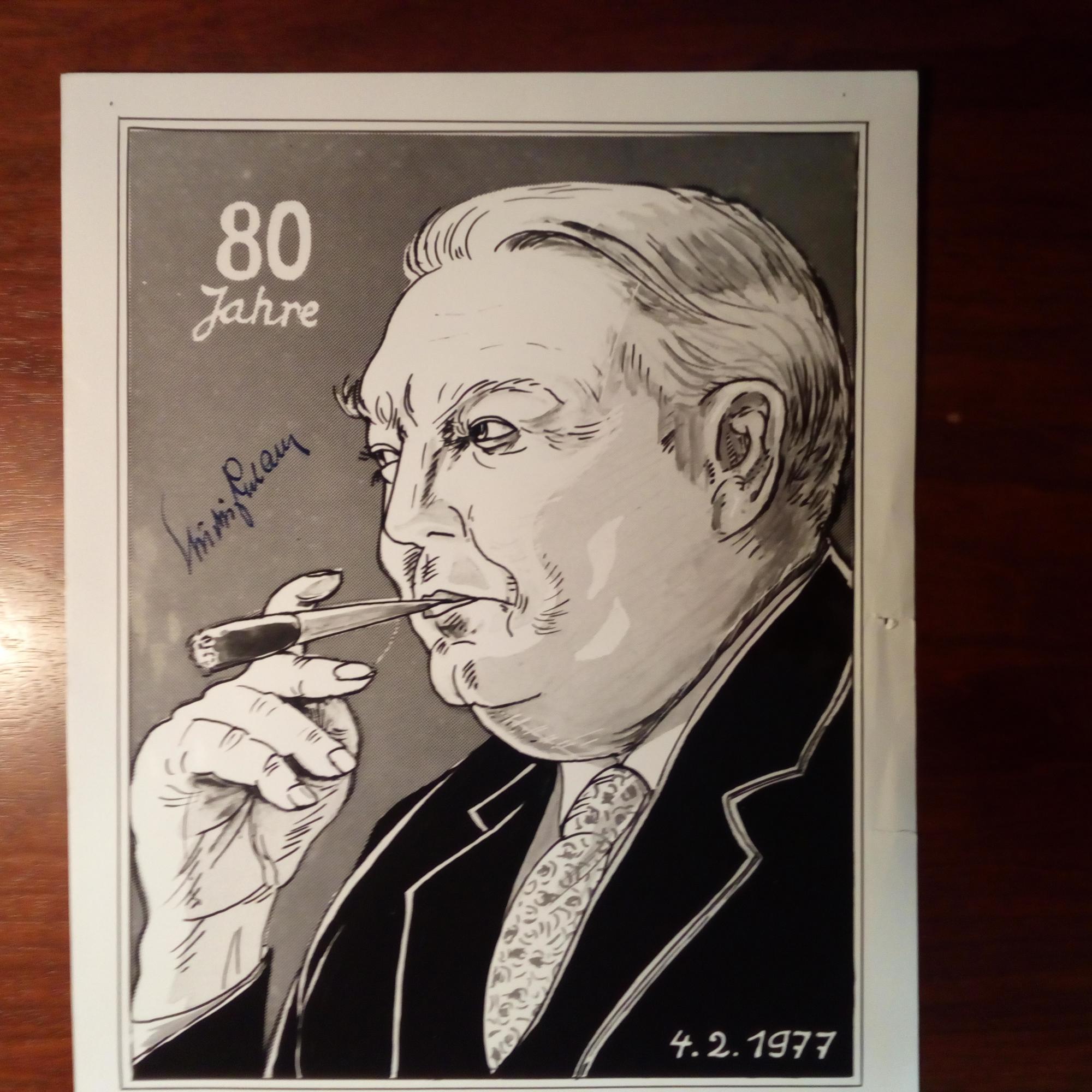 1897-1977, Bundeskanzler - Pfo. (folio, mit Zigarre, nach einer Zeichnung) mit U. Wohl Vorlage für Briefmarke zum 80. Geb. (ein fertiger Abzug liegt bei), rechter Rand etw. beschädigt.