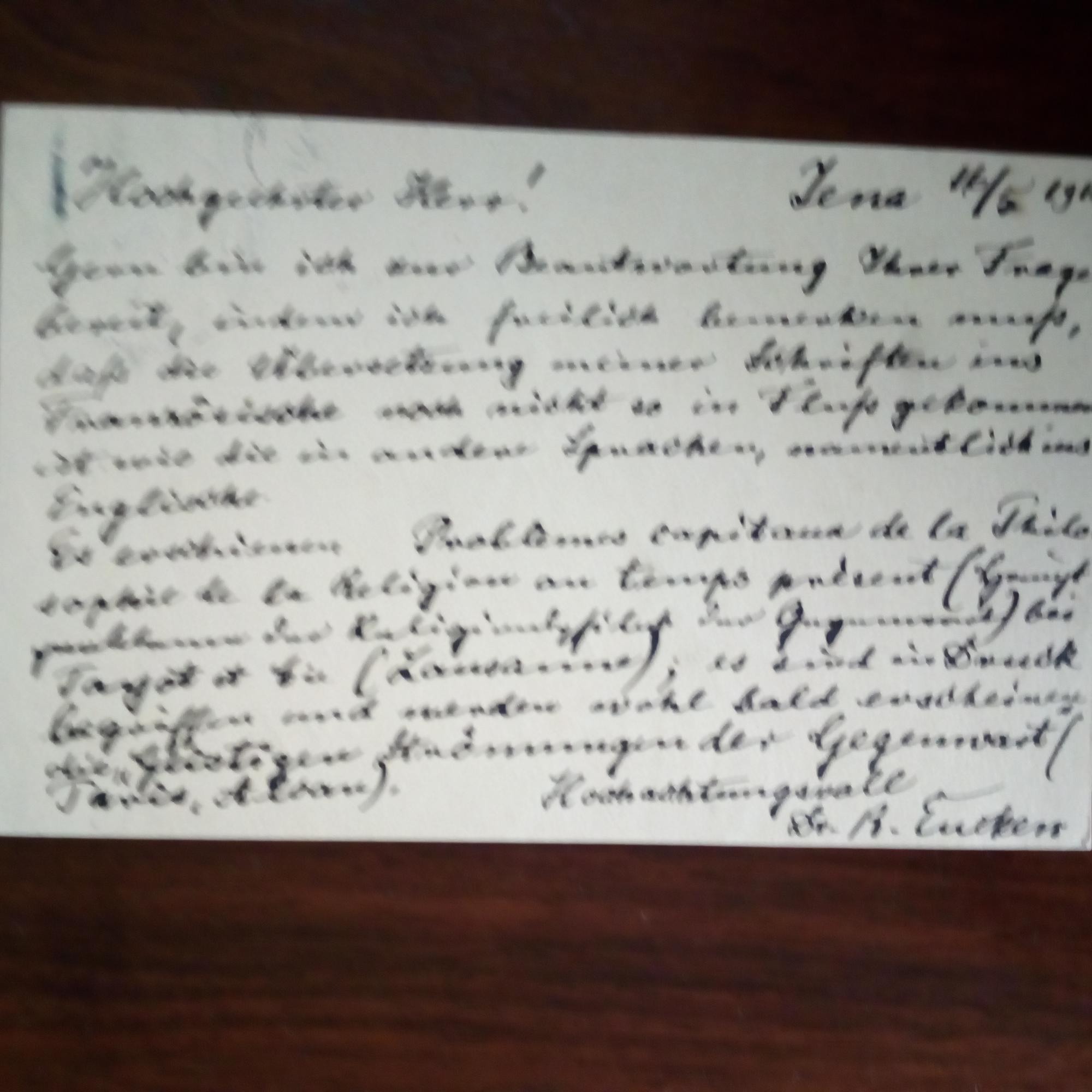 1846-1926, Philosoph - E. postal. Postkarte mit U., kl. Schrift. Jena 16.5.1910. An den Publizisten Franz Herwig (1880-1931) in München, der nach frz. Übersetzungen seiner Werke gefragt hatte: ...Es erschienen Problèmes capitaux de la Philosophie de la Religion au temps présent...werden wohl bald erscheinen die "Geistigen Strömungen der Gegenwart"...