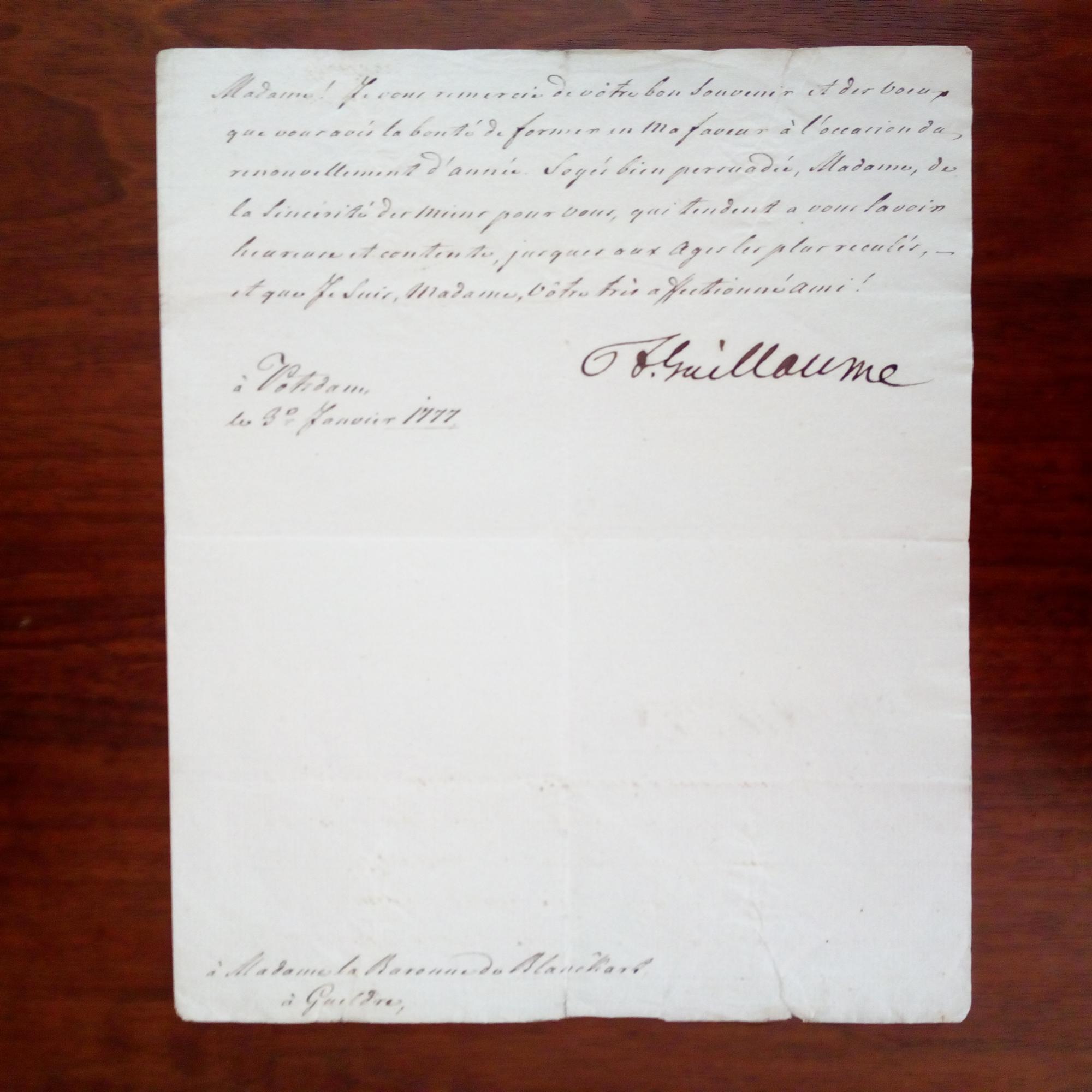1744-97, König - Brief mit U., Potsdam 3.1.1777, ½ S. kl. 4°. Frz. Dankt der befreundeten Baronin von Blanckart in Geldern ausführl. für Neujahrsgrüße.