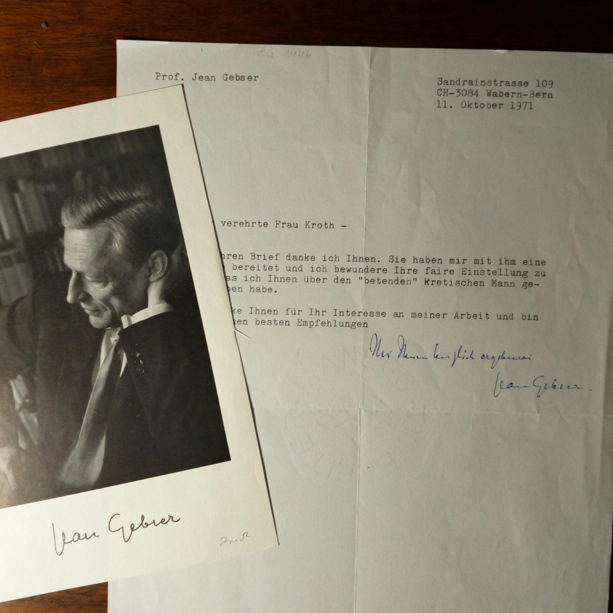 1905-73, Philosoph und Schriftsteller, Bewusstseinsforscher - Brief mit E. und U., Wabern bei Bern 11.10.1971, ½ S. 4° An Frau Kroth: ...bewundere Ihre faire Einstellung zu dem, was ich Ihnen über den "betenden" Kretischen Mann geschrieben habe... Beiliegt ein e. Umschlag und ein Blatt mit mont. Druck-Pfo. und Faklsimile-U.