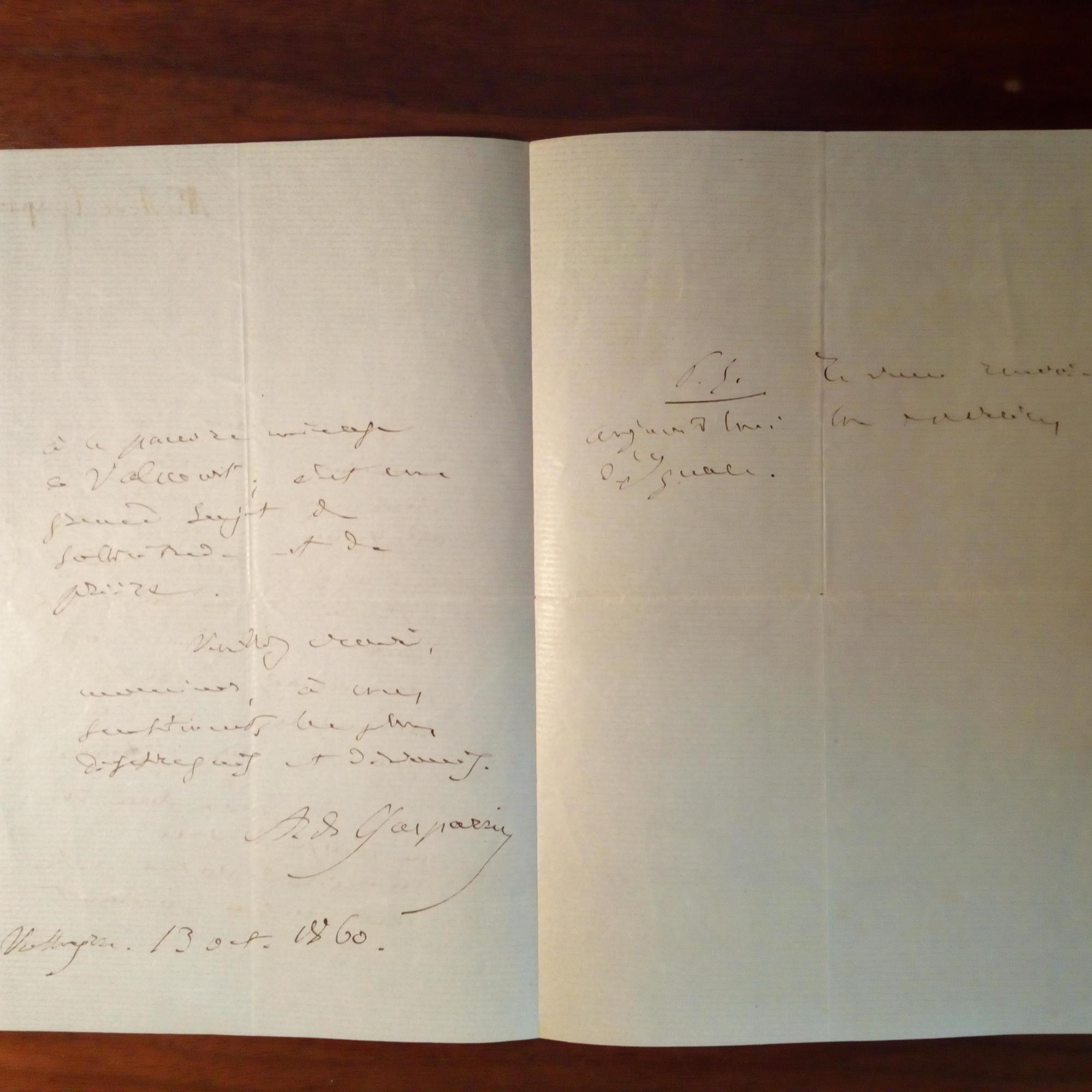 1810-71, frz. Jurist und Publizist, Kämpfer für die Religionsfreiheit - E. Brief mit U., bei Genf 13.10.1860, 2 ½ S. 8°. Sagt seine Unterstützung für ein Projekt zu.