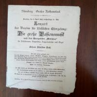 Schönes Programmheft (8 S. 4°, Büttenpapier) des Nürnberger "Vereins für klassischen Chorgesang" zur Aufführung von Bachs "Die große Passionsmusik nach dem Evangelisten Matthäus" im Rathaussaal am 3.4.1892 (180 Damen, 150 Männer, 30 Schüler aus einem Gymnasium, Doppelorchester, Orgel...). Ger. Altersspuren.
