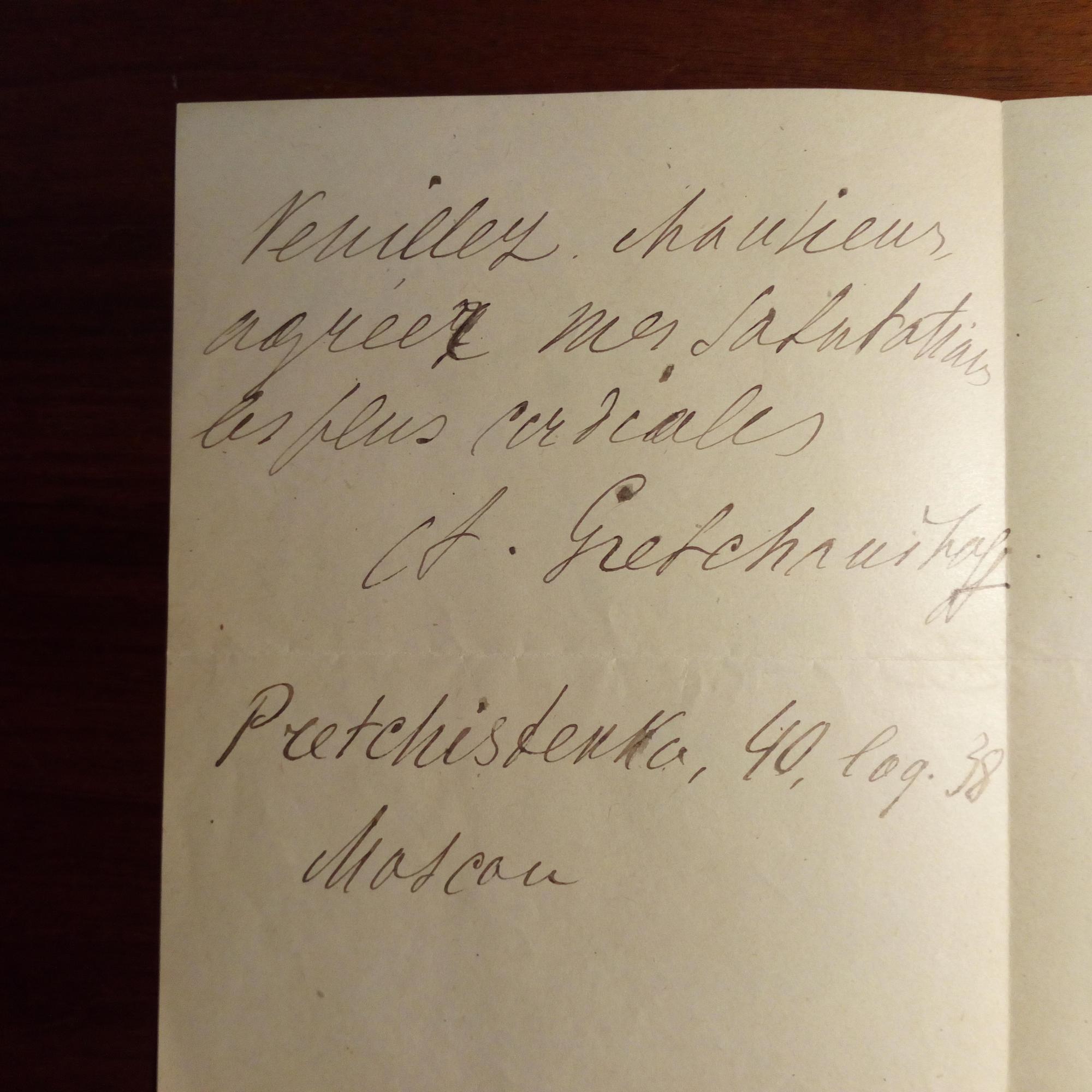 1864-1956, russ. Komponist - E. Br. m. U., Moskau 25.8.(1923), 1 ¾ S. 8°. An den Direktor des Schott-Verlages Willy Strecker (1884-1958): ...Je vous envoye les epreuves de mon album pour piano" (sein "Kinderalbum", op. 98): ...J'ai été très content de constater qu'il n'y avait presque pas de fautes...