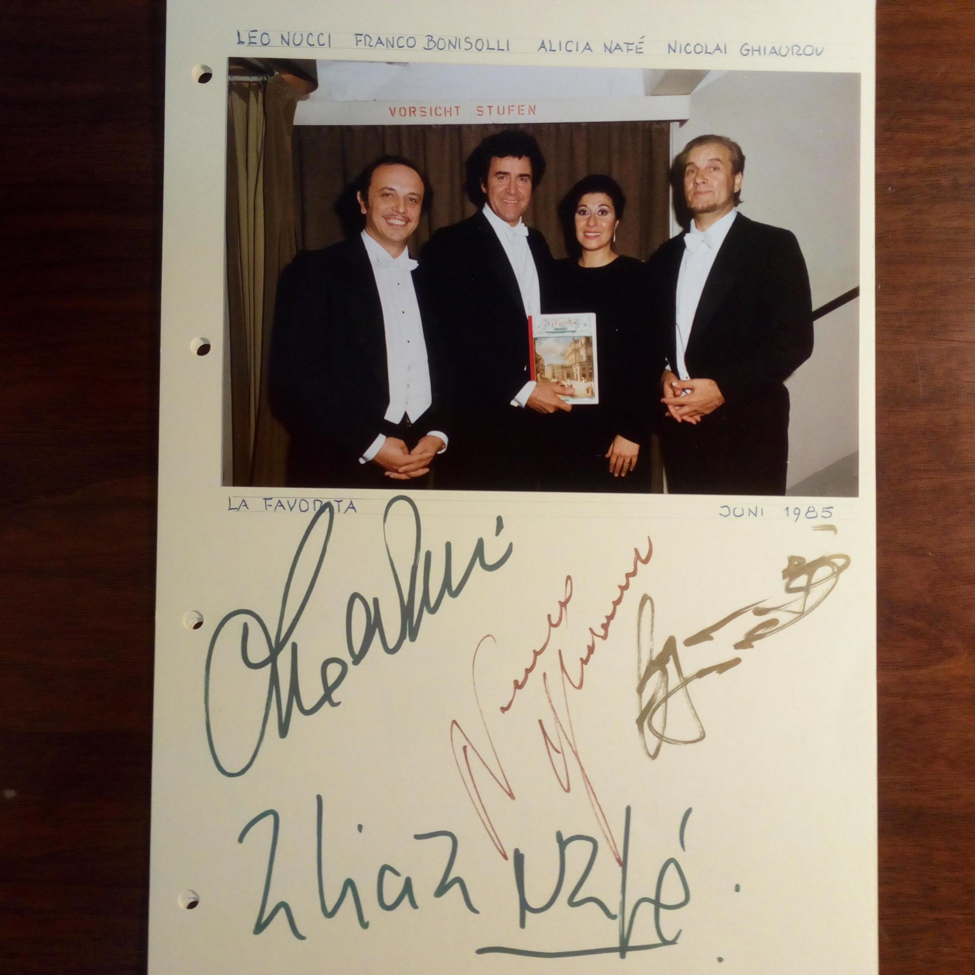 3 große Farb-Gruppenfotos (quer) von Mitwirkenden bei konzertanten Aufführungen der Hamburgischen Staatsoper, je mont. auf 4°, darunter alle 13 U.: "La Favorita" von Donizetti, 1985: dabei Franco Bonisolli (1938-2003), Nicolai Ghiaurov (1929-2004)... Requiem von Verdi 1986: Kurt Moll (1938-2017)... "Die Puritaner" von Bellini 1987: Dirigent Stefan Soltesz (1949-2022), Sängerin Edita Gruberova (1946-2021)...