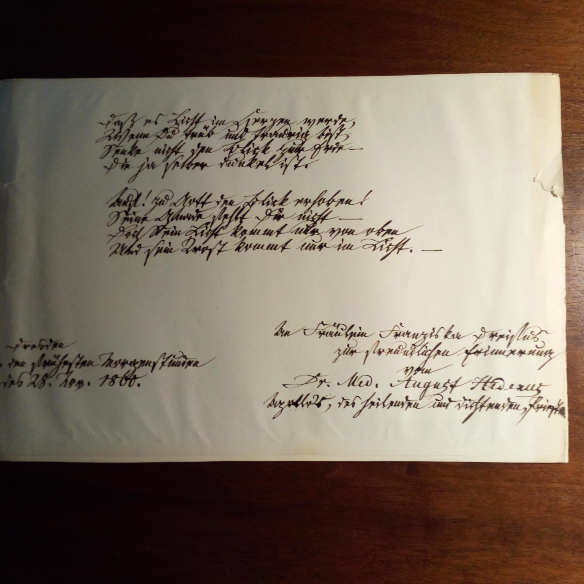 1797-1862, Arzt und Ästhetiker - Schönes e. 4°-quer-Blatt mit U., Dresden "in den frühen Morgenstunden" 28.11.1860. Gedicht (2 Str. à 4 Z.), Widm. (für Fräulein Franziska Preistus) und U., Altersspuren o. Verlust.