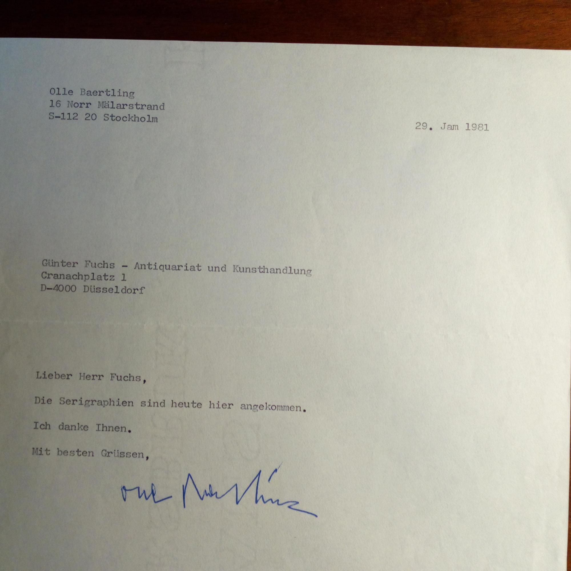 1911-81, schwed. Künstler - Br. m. U., Stockholm 29.1.1981, ½ S. 4°. An den Kunsthändler Günter Fuchs (1935-2007) in Düsseldorf: ...Die Serigraphien sind heute hier angekommen...