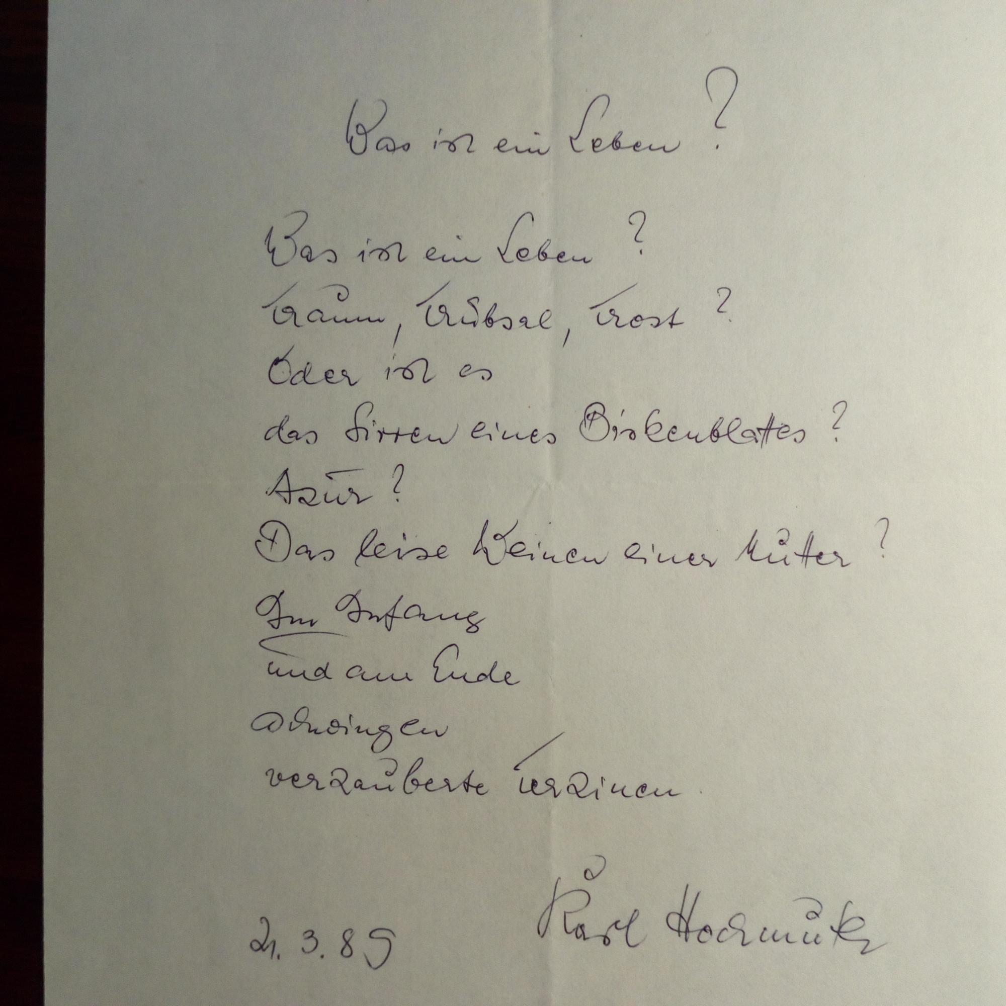 1919-2002, Schriftst. - E. Gedicht ("Was ist ein Leben?", 10 Z.) m. U. u. D. 21.3.1989, e. postal. Umschl. (gedr. Abs.).