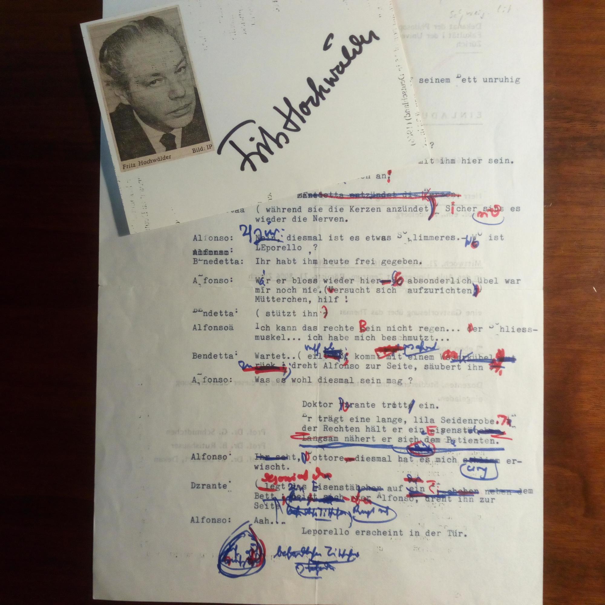 1911-86, österr. Schriftsteller - Typoskript m. vielen e. Verbesserungen, 1 S. 4°. Lt. e. kl. Begleitbr. m. U.: Anfang der 5. Szene seines Dramas "Leporello sucht einen besseren Herrn" (1985).