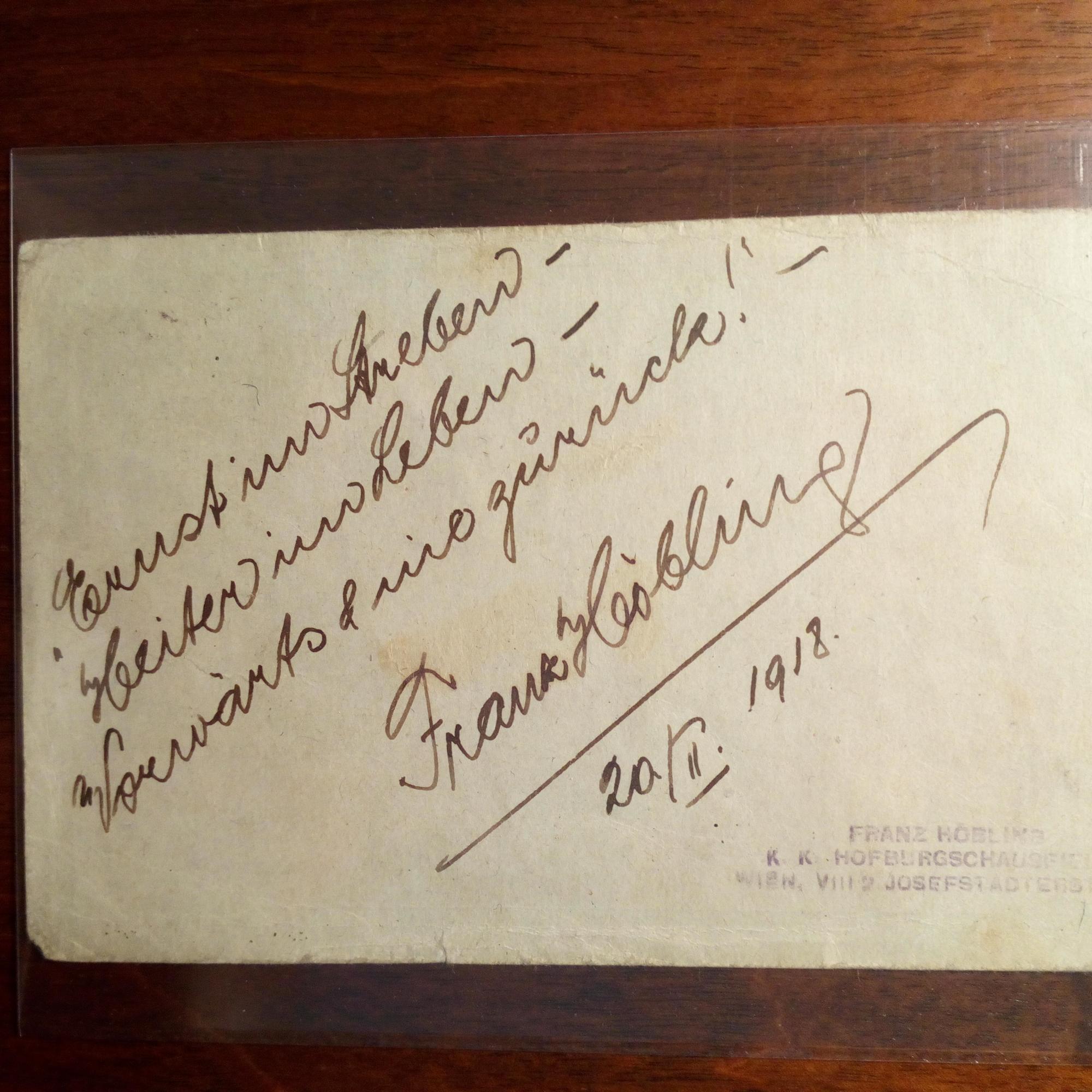 1886-1965, österr. Sänger und Schauspieler - E. postal. Postkarte m. e. Zitat, U. u. D., (Wien) 20.2.1918, Abs.stempel, stärkere Gebr.spuren. Als "K.K. Hofburgschauspieler": "Ernst im Streben-/ Heiter im Leben-/ Vorwärts & nie zurück!" (3 Z.).