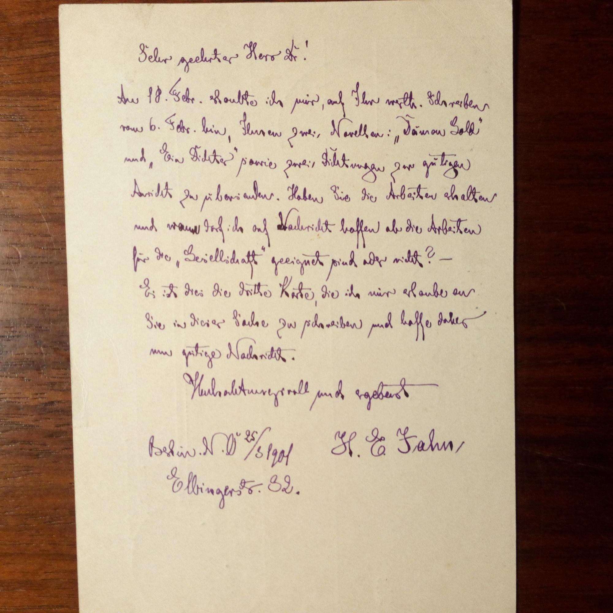 1857-1933, Schriftsteller - E. postal. Postkarte mit U., Berlin 25.3.1901, ger. Gebr.spuren. An den Mäzen und Kulturhistoriker Alfred Nathan Gotendorf (1858-1914), damals Redakteur der Zeitschrift "Die Gesellschaft" in Berlin: Bietet ihm versch. seiner Dichtungen an. ...Es ist dies die dritte Karte...in dieser Sache...