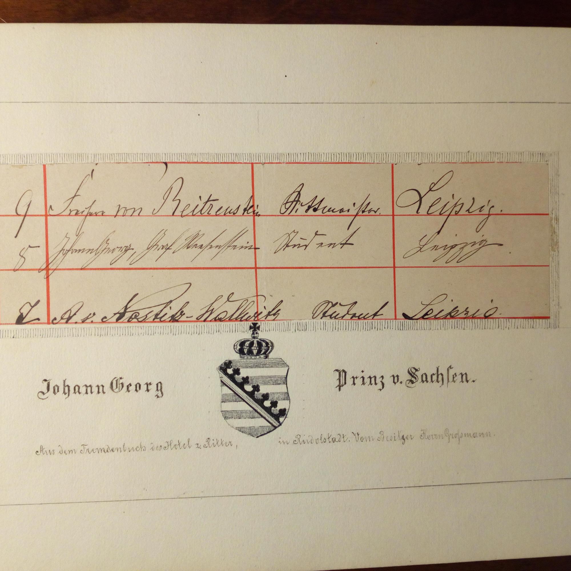 1869-1938, Prinz - Eintrag aus dem Reservierungs-Buch des Hotels "Ritter" in Rudolstadt mit U. (als "Student" aus Leipzig). Darunter die seiner Begleiter: Rittmeister Karl von Reitzenstein (1841-1917) und dem späteren Staatsmann Alfred von Nostitz-Wallwitz (1870-1953). Mont. auf Stich-verziertes 4°quer-Sammlerblatt.