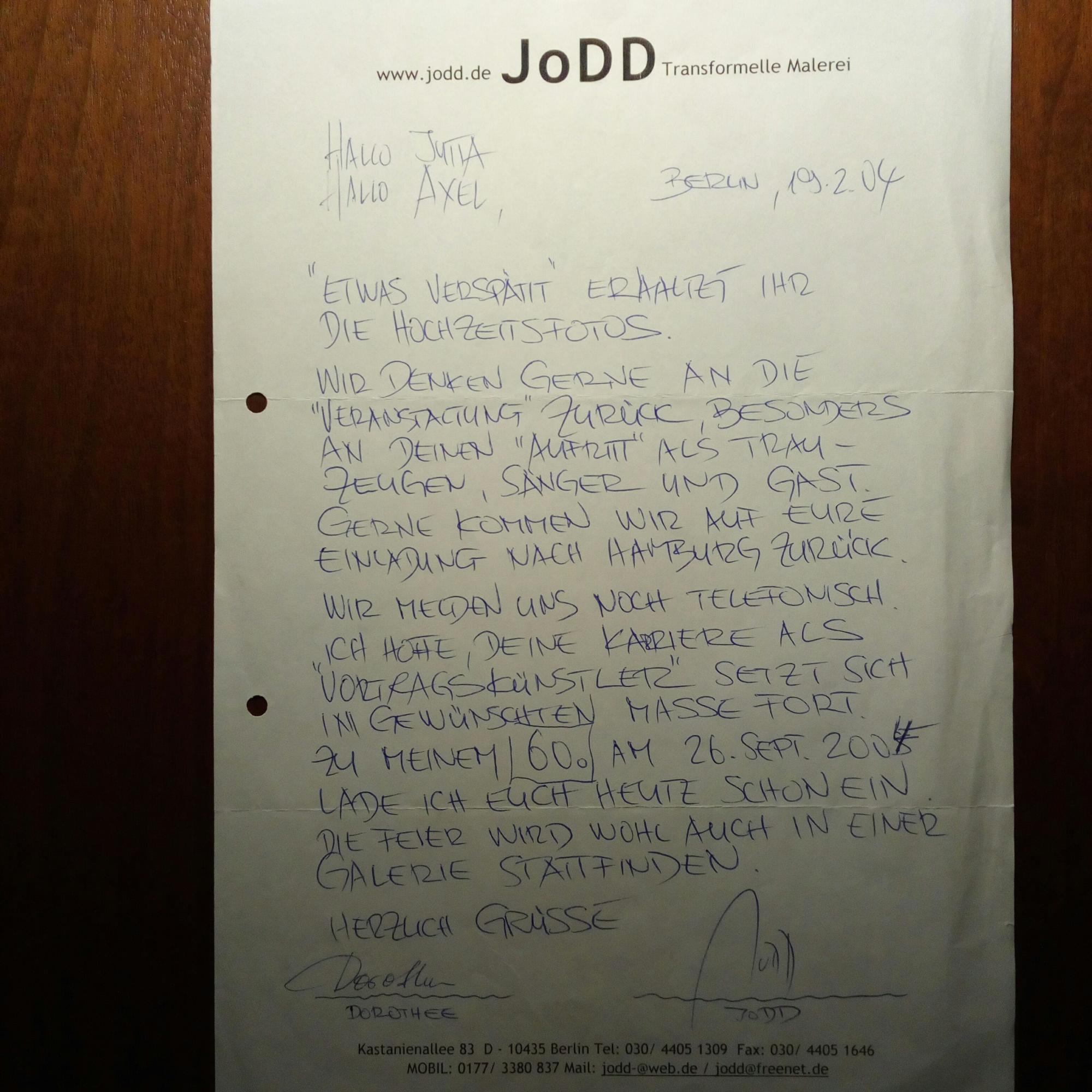 1944-2025, Künstler ("Transformelle Malerei") - E. Brief mit U. (weitere U. seiner Gattin Dorothee), Berlin 10.2.2004, 1 S. 4°, Briefkopf. An "Jutta und Axel": Bedanken sich für ein schönes Hochzeitsfest in Hamburg, gegenseitige Einladungen und: ...hoffe, Deine Karriere als "Vortragskünstler" setzt sich im gewünschten Maße fort...