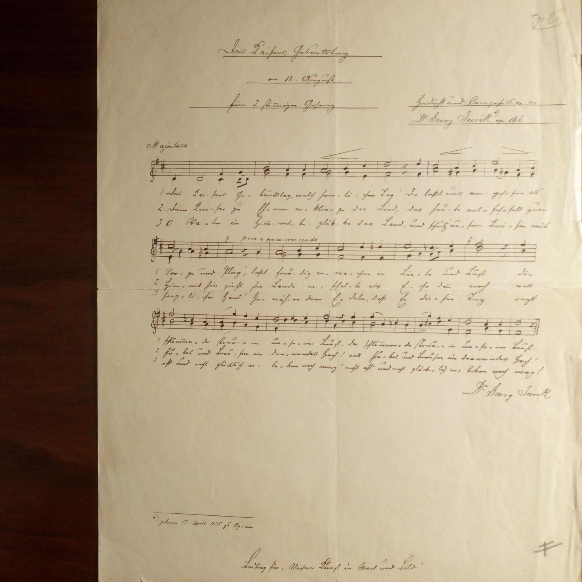geb. 1835 in Zagreb, österr. Komponist - "'Des Kaisers Ge-burtstag...für 2stimmigen Gesang'...op. 166", 3 e. Notenzeilen und Text (3 Str.), zum 60. Geb. von Kaiser Franz Joseph I., ¾ S. folio, 2 x U., kl. Gebr.spuren. (publiz. in dem Pracht-Band "Unsere Kunst in Wort und Bild. Unter dem Protectorate...Maria Theresias", Hrsg. R. Wittmann, Wien 1890).