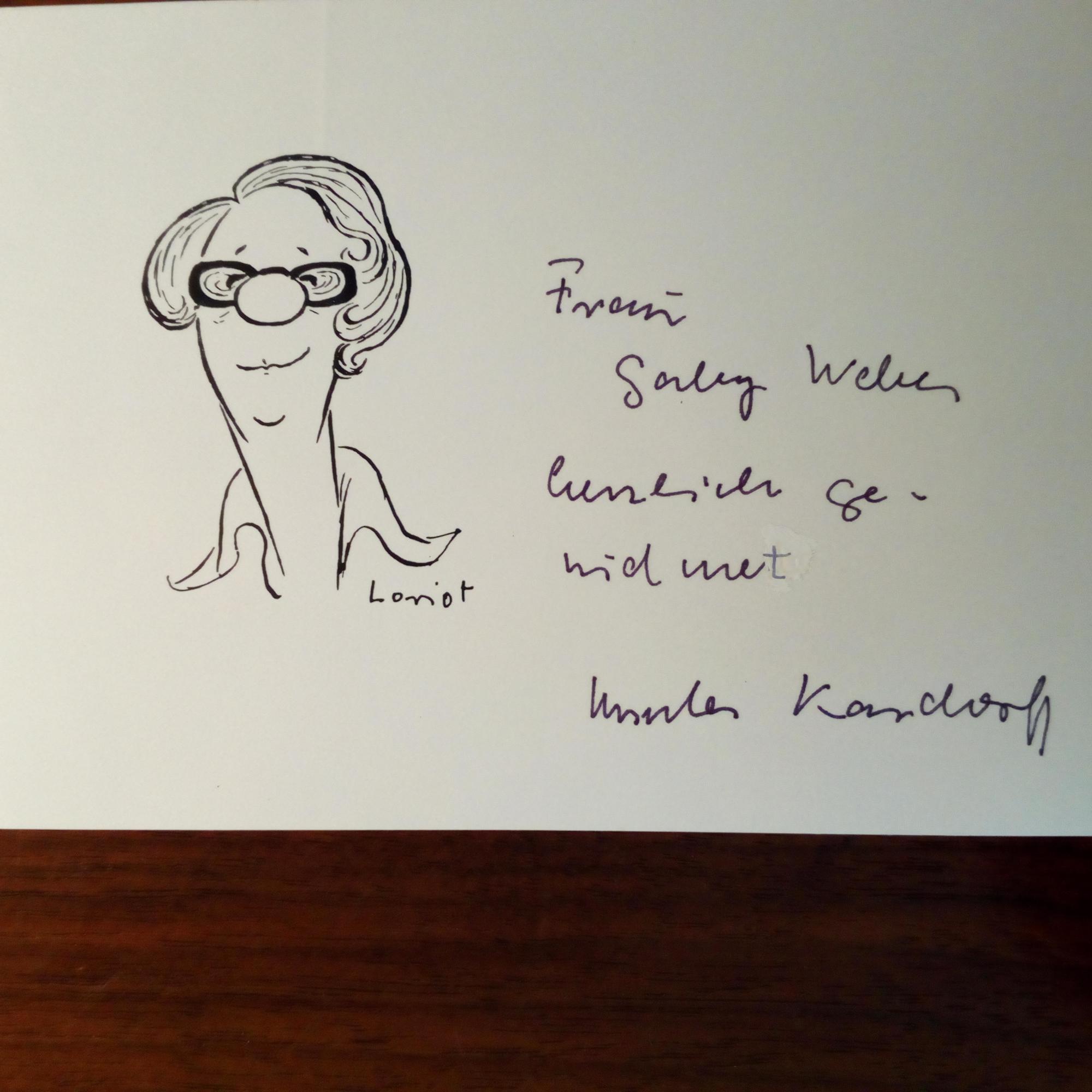 1911-88, Journalistin - 8°-Blatt mit mont. Druck des Umschlagbildes ihres Buches "Durch meine Brille" (1965) und U., Briefkopf der SZ. Beiliegen: Widm.karte (mit Pfo. nach einer Karikatur von ihr v. Loriot), Farb-Pfo. und Kärtchen, alle je mit Widm. und U.