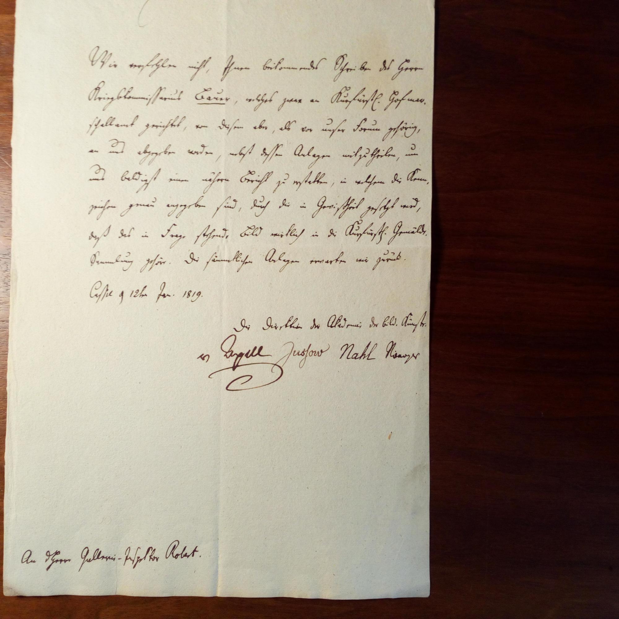 Brief der Direktion der Kasseler Akademie der bild. Künste (Br.kopf) mit 4 U., dabei der Maler Johann August Nahl (1752-1825) und der Architekt Heinrich Christoph Jussow (1754-1825), 12.1.1819, ¾ S. folio. An den "Gallerie-Inspector Robert (Ernst Friedrich, 1763-1843, Maler): ...daß das Frey stehende Bild...in die Kurfürstl. Gemälde-Sammlung gehöre...