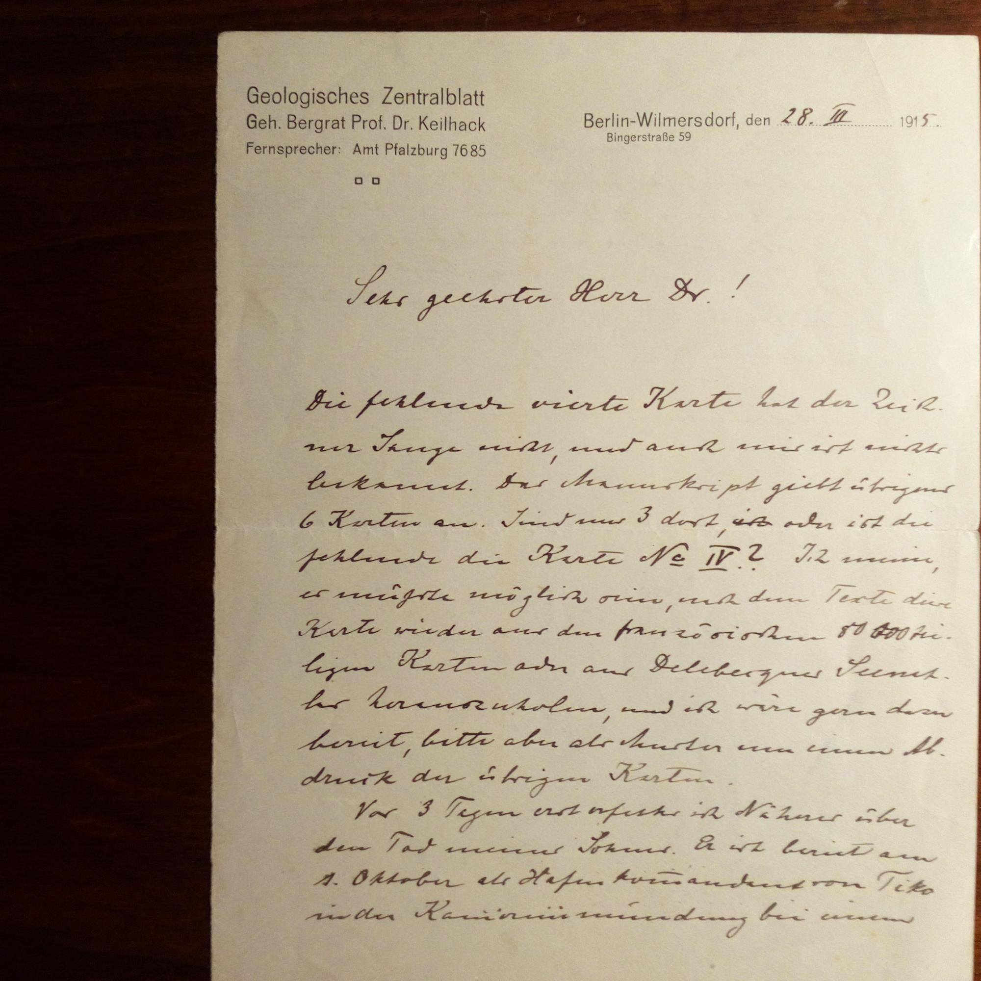 1858-1944, Geologe - E. Br. m. U., Br.kopf des "Geologischen Zentralblattes" in Berlin-Wilmersdorf 28.3.1915, 1 ½ S. 8°, kl. Schrift ...Das Manuskript gibt übrigens 6 Karten an. Sind nur 3 dort ... erfuhr ich Näheres über den Tod meines Sohnes ... als Hafenkommandant von Tiko...