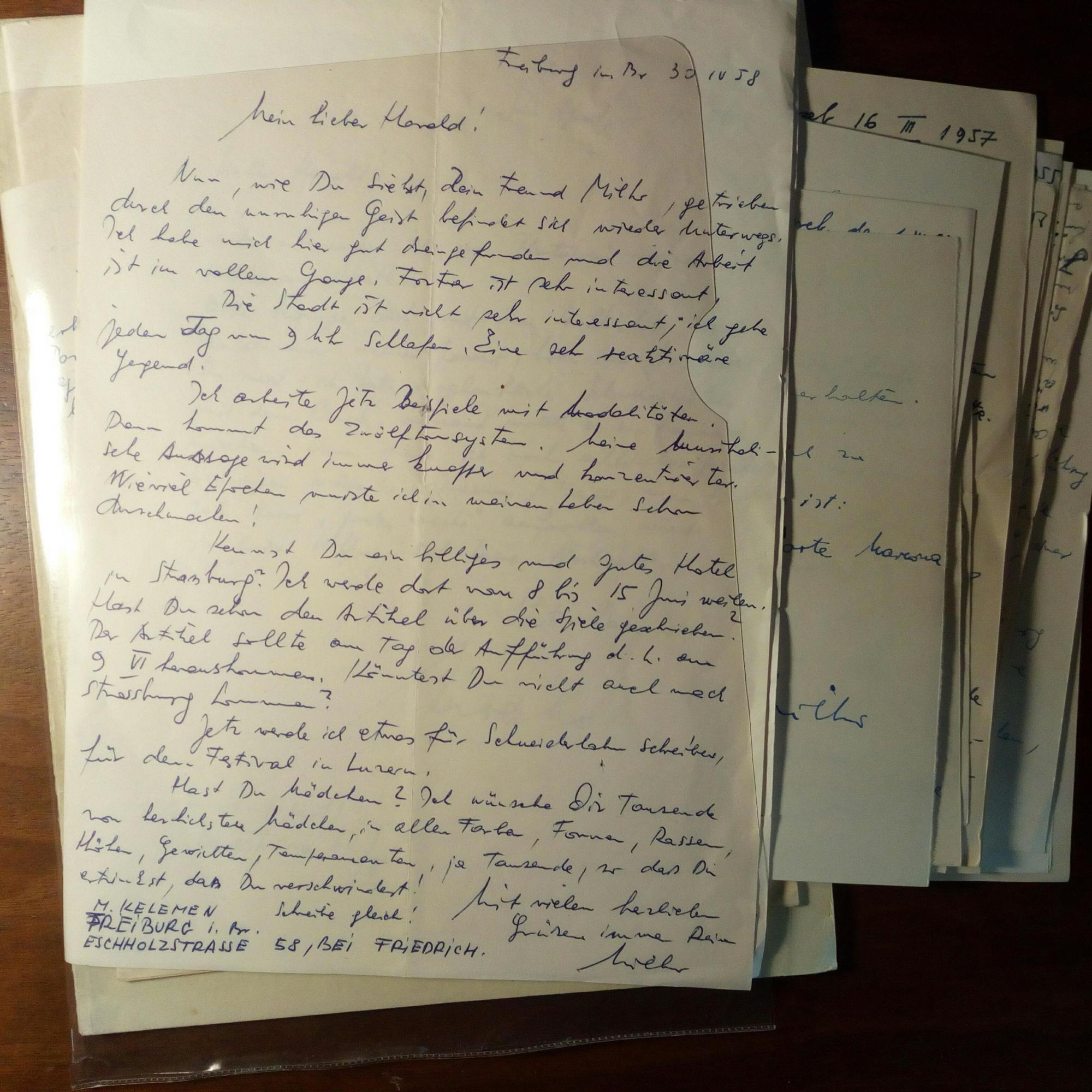 1924-2018, kroat. Komponist - 39 e. Br. (zus. ca. 83 S., versch. Formate, teilw. dicht beschr.) und 2 e. postal. Karten, je mit U., Zagreb, Paris, Freiburg 1955-86, meist gut erh. Deutsch an den befreundeten Harald Strauß in Straßburg: Treffen in Paris, Persönl. (...bin in den letzten zwei Jahren krank gewesen, und ich bin es noch...habe eine schwere Depression...) und viele Details zu seinen Arbeiten (...Ich arbeite jetzt Beispiele mit Modalitäten. Dann kommt das Zwölftonsystem. Meine musikalische Aussage wird immer knapper...). Dazu 2 gedr. Partituren, eine mit Widm. für dens. mit U.