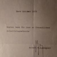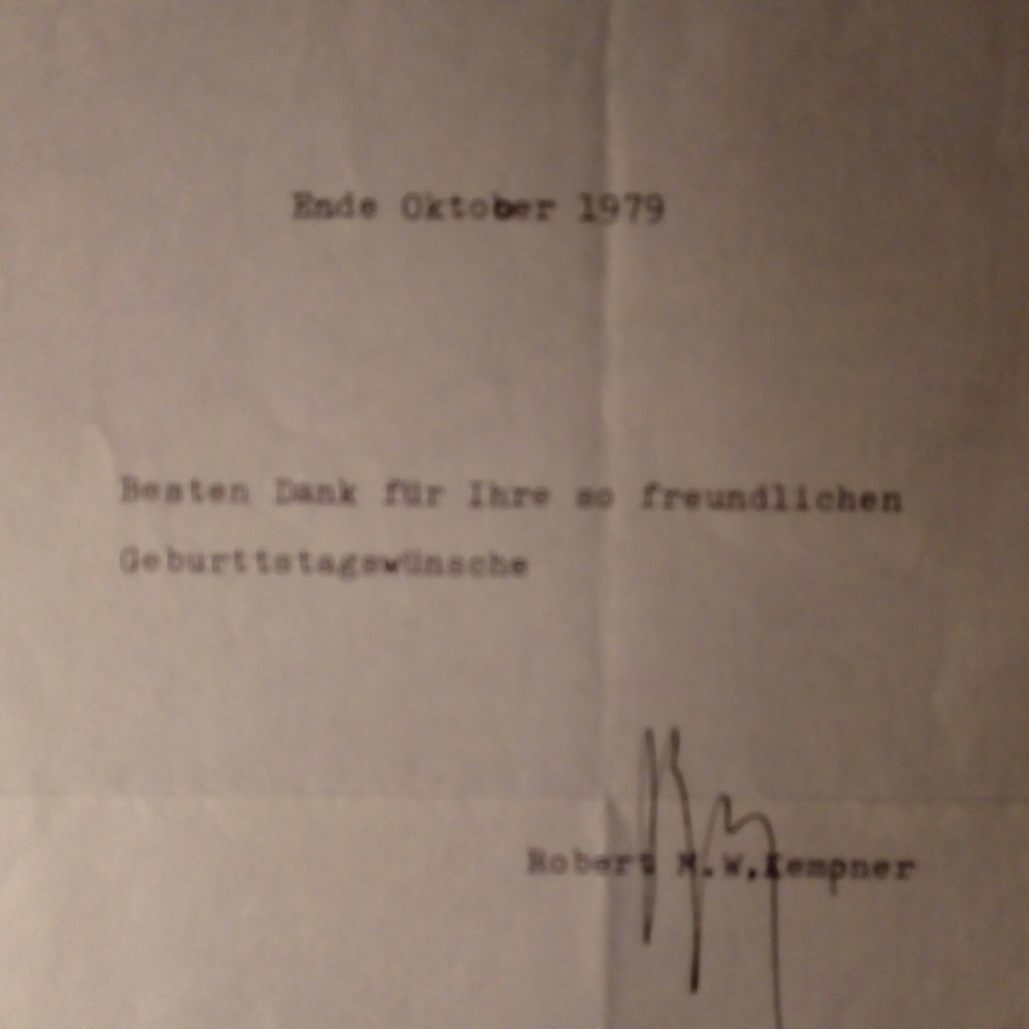 1899-1993, Jurist, stellvertr. Ankläger im "Nürnberger Prozess" - Kurzbr. mit U., Ende Okt. 1979. Dankt f. Wünsche.