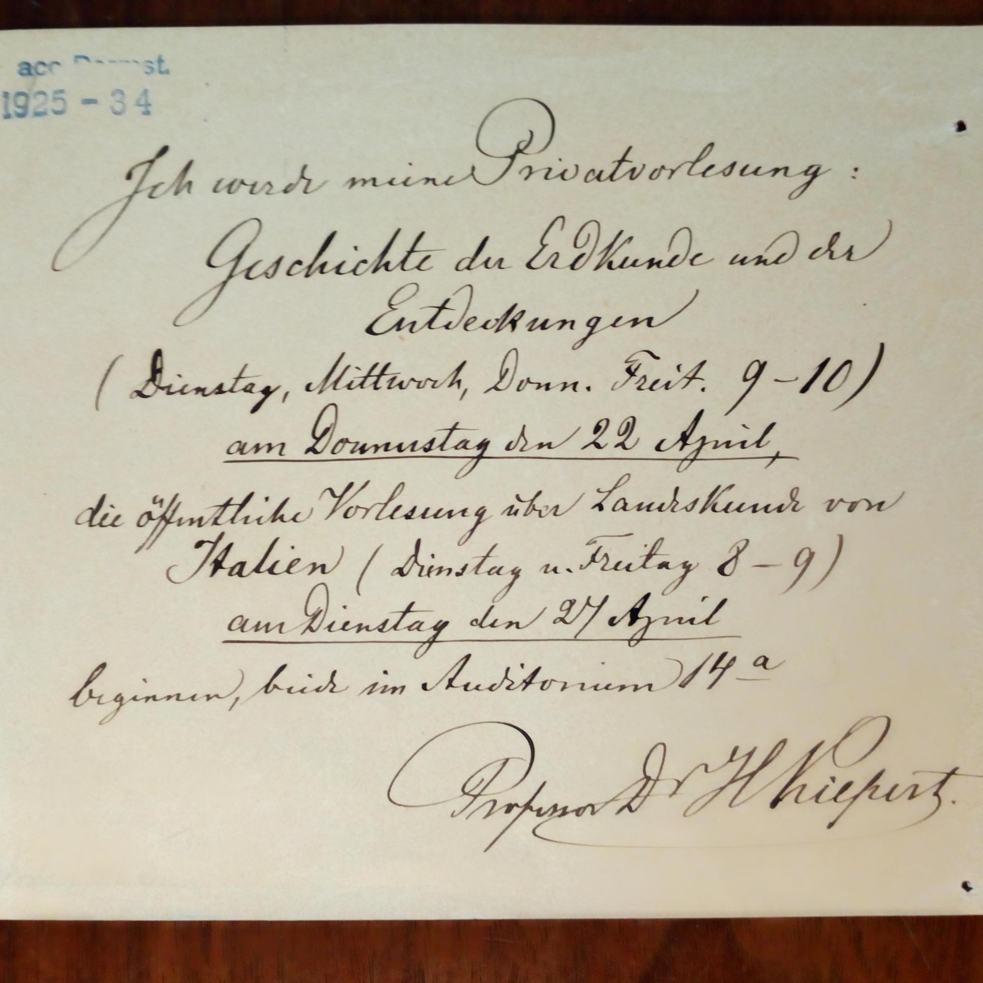 1818-99, Geologe, Forschungsreisender und Kartograph - Schönes 8°quer-Blatt mit e. Mitt. und U., (München nach 1871), ger. Nadel-Perforierungen, Aktenstempel. Ankündigung seiner "Privatvorlesungs"-Reihe "Geschichte der Erdkunde und der Entdeckungen" und der öffentl. Vorlesung "Landeskunde von Italien" .