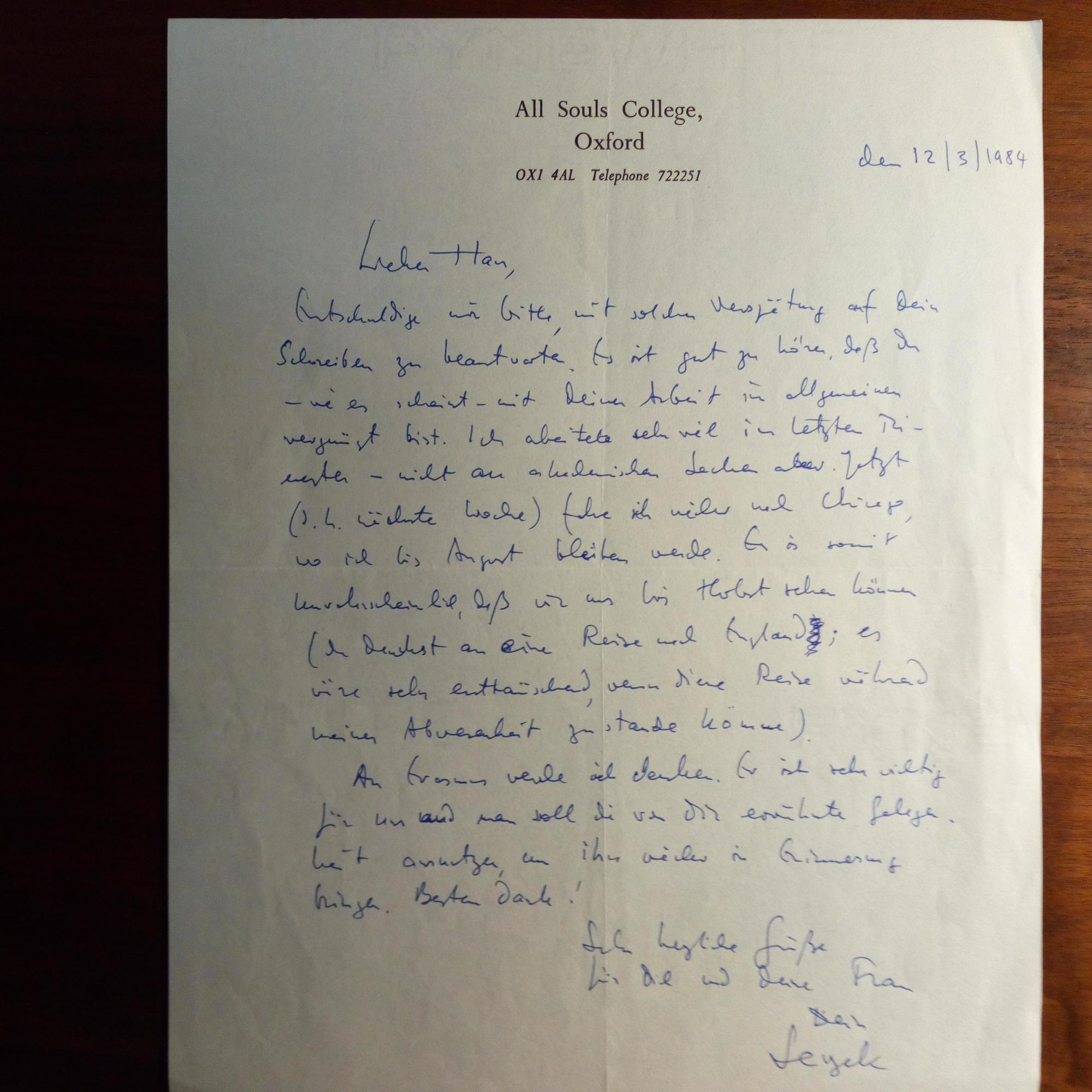 1927-2009, poln. Philosoph - E. Br. m. U., (Oxford) 12.3.1984, 1 S. 4°, Br.kopf des "All Souls College". An den Lektor des Piper-Verl. Hans Rößner (1910-97) in München über seine Pläne: ...An Erasmus werde ich denken. Es ist sehr wichtig für uns und man soll die von dir erwähnte Gelegenheit ausnutzen, um ihn wieder in Erinnerung...