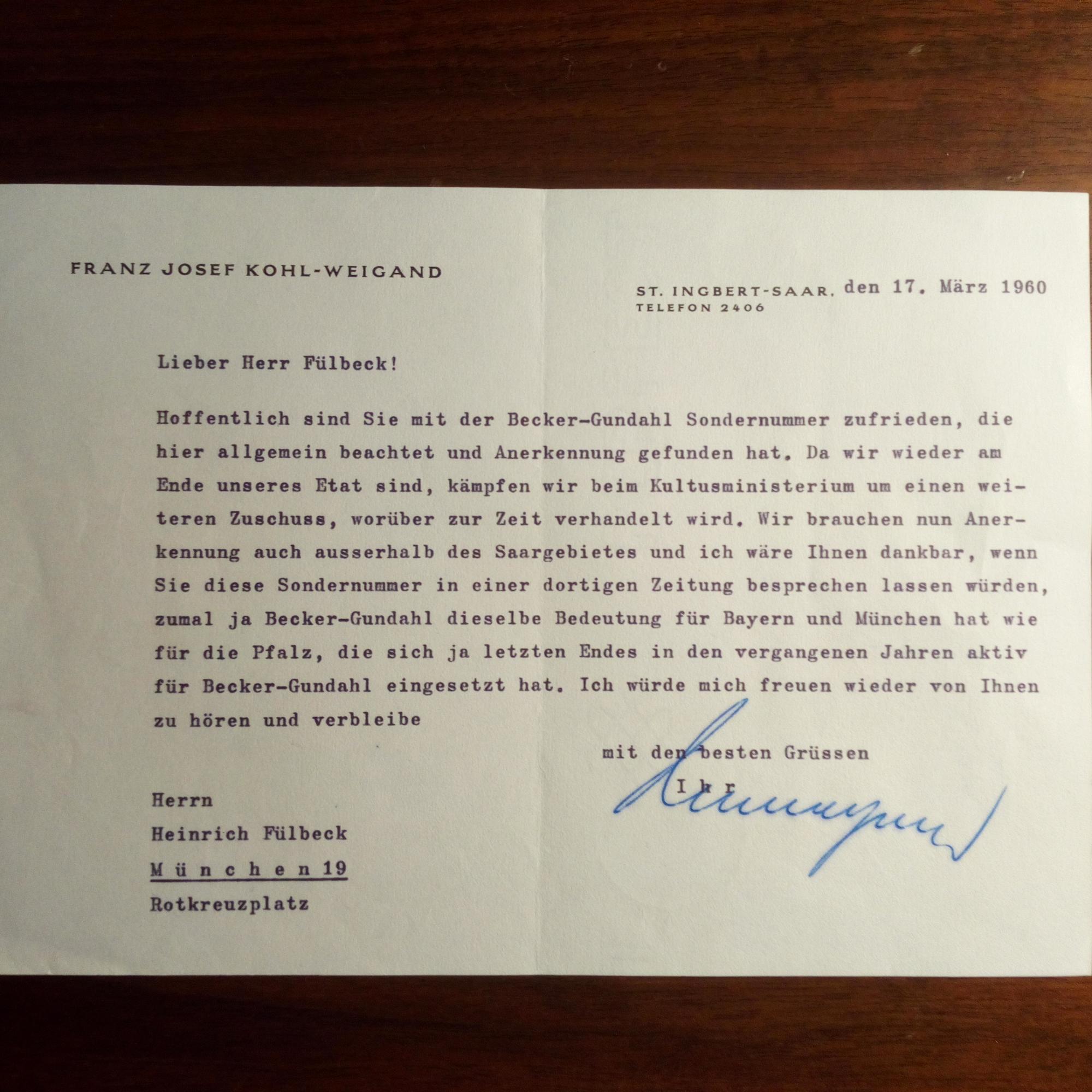1900-72, Kunst-Sammler u. Publizist - Br. m. U., (St.Ingbert) 17.3.1960 , 1 S. 8° quer, Br.kopf, m. Umschlag An den Münchner Verleger Heinrich Fülbeck betr. einer Publikation über den Maler Carl Becker-Gundahl (1856-1925). Beiliegt Faksimile-Karte.