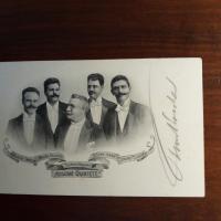 1845-1914, österr. Sänger und Lieder-Komponist - Ansichtskarte (Weltpostverein, Gruppenfoto des "K.-Quintetts") m. e. Notenz. (3 Takte, "Verlassen, verlassen") u. U., Bleistift, kl. Gebr.spuren.