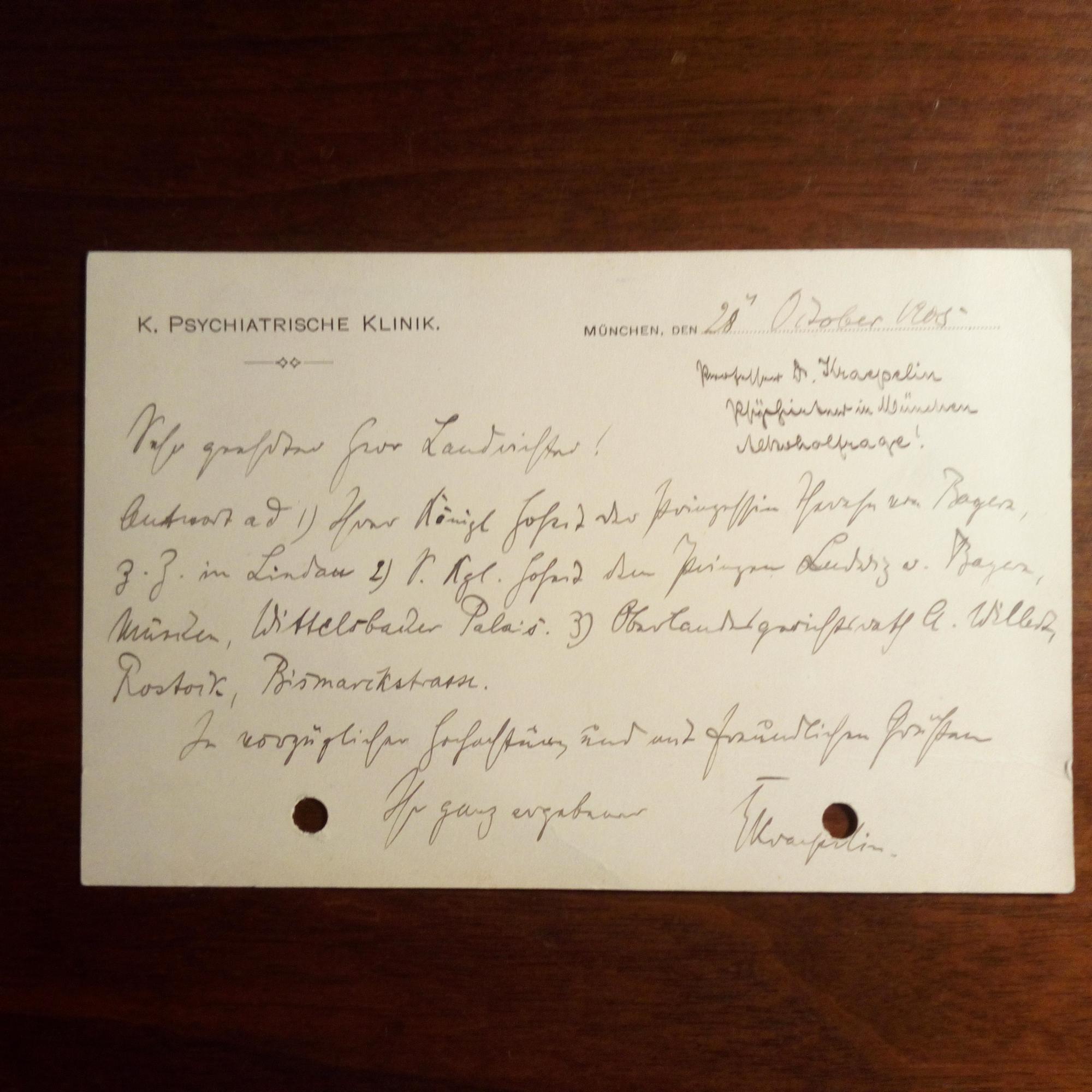 1856-1926, Psychiater - E. Briefkarte mit U., (München) 28.10.1905, 1 S., Briefkopf, gel. E. Mitt. an "Herrn Landrich-ter": ...Antwort ad 1) Ihrer königl. Hoheit der Prinzessin Therese von Bayern, z.Zt. in Lindau 2) S. kgl. Hoheit dem Prinzen Ludwig von Bayern...