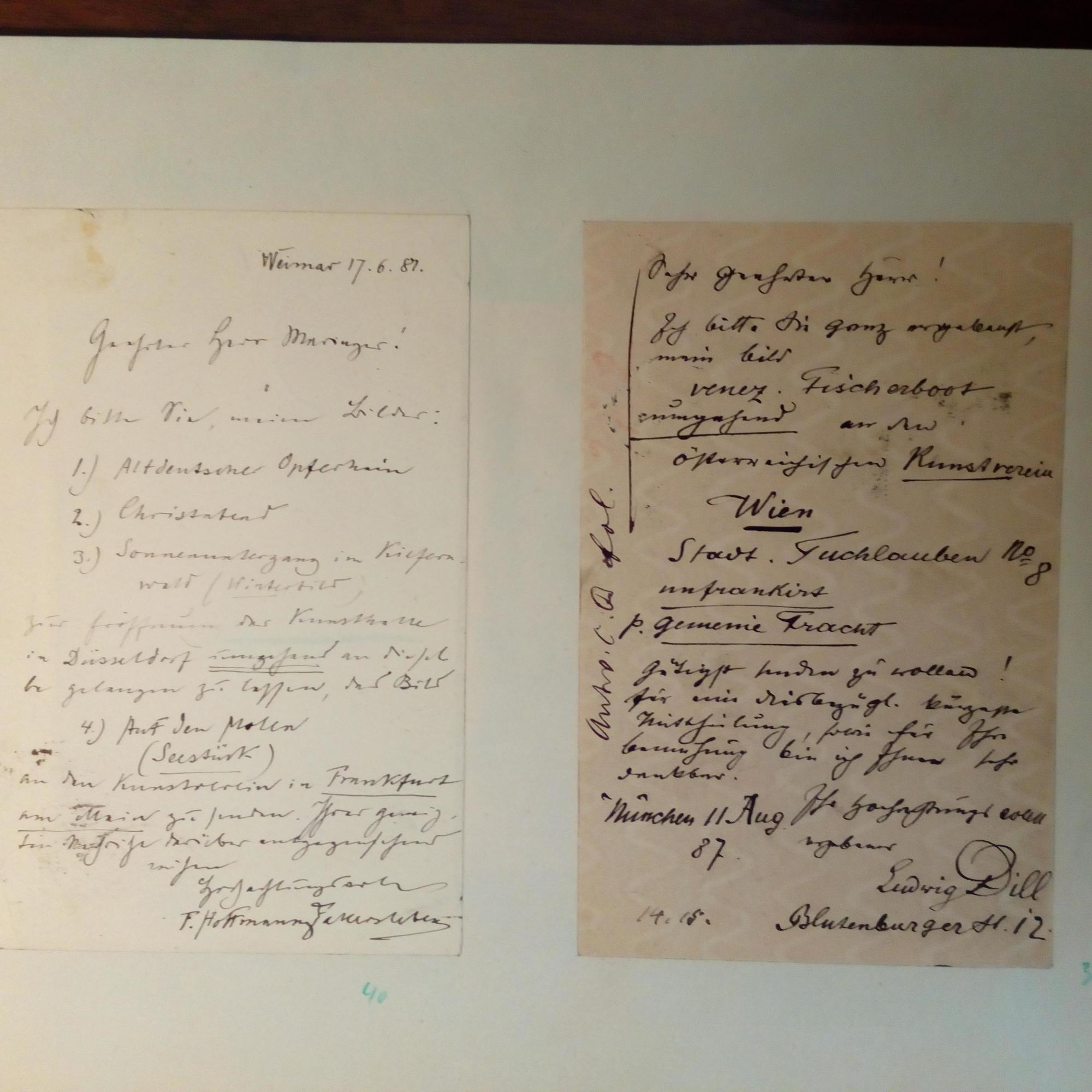 1838-1911, Maler - E. Brief mit U., Düsseldorf 22.4.1891, 1 S. 8°, mont. An die Düsseldorfer Kunsthalle betr. eines seiner dortigen Bilder. Auf Rückseite mont. sind e. postal. Postkarten mit U., mit ähnl. Inhalt, von den Malern Franz Hoffmann-Fallersleben (1855-1927) in Weimar und Ludwig Dill (1848-1940) in München .