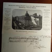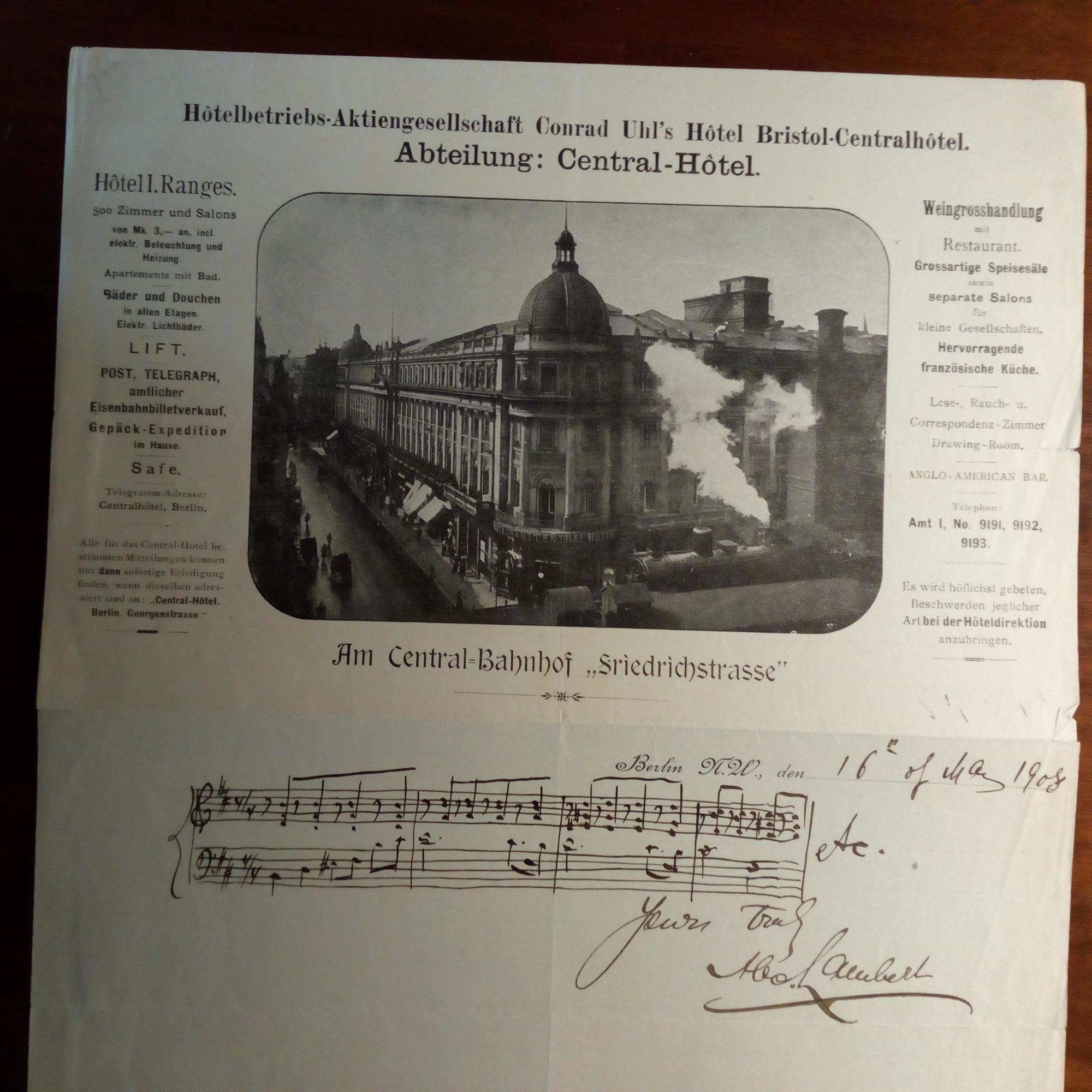 1862-1929, poln. Pianist - Briefbogen (gr.4°) des Hotels "Central" in Berlin (großer Briefkopf m. Abbildung des Hotels) m. 2 e. Notenz. (3 Takte), E., U. u. D. 16.3.1908.