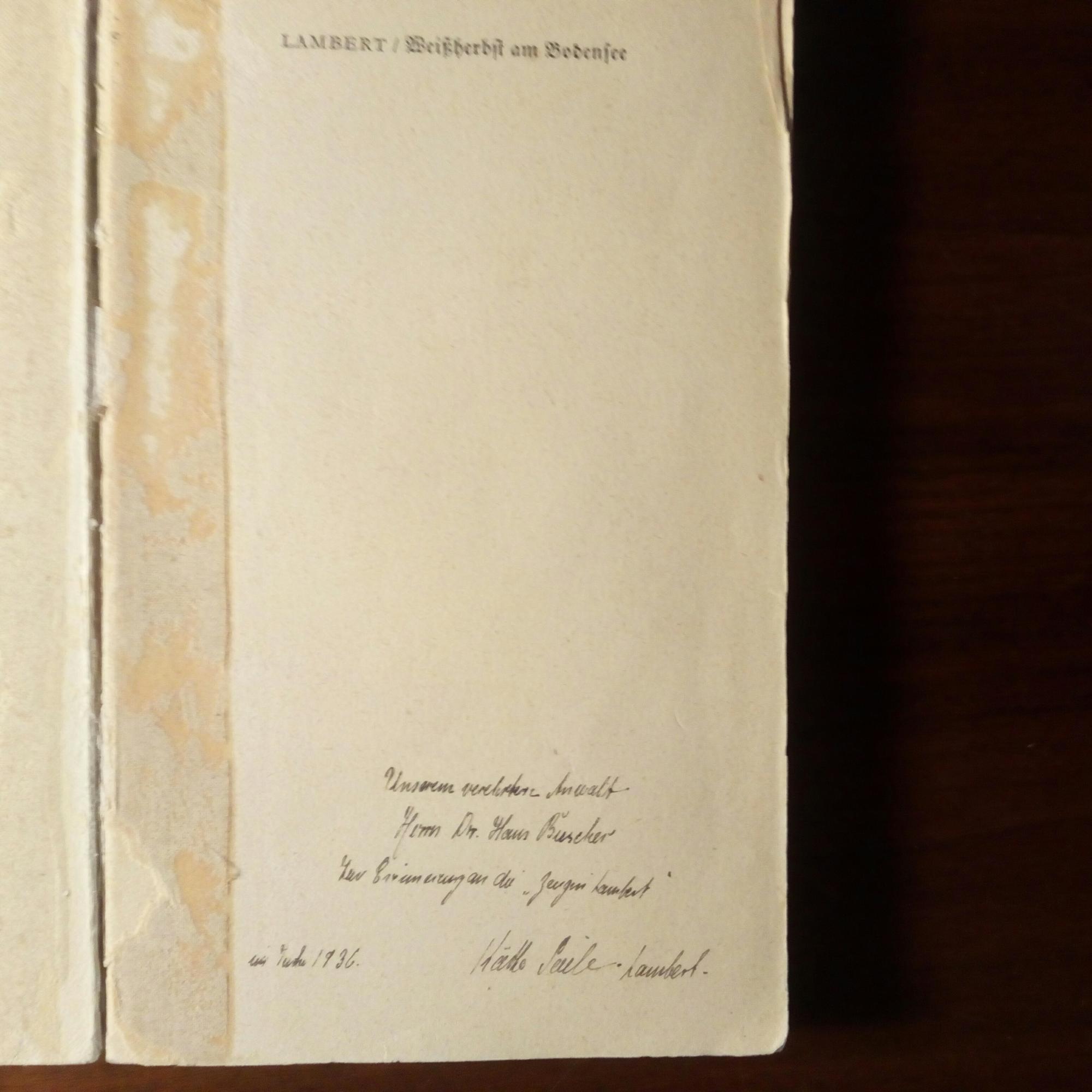 1899-1955, Schriftstellerin - Widm. (an Rechtsanwalt Hans Büscher "zur Erinnerung an die "Zeugin Lambert"") und U. ("Käthe Seiler-Lambert"), Juli 1936, auf Vorsatz ihres Ullstein-TB "Weißherbst am Bodensee. Roman", Klebestreifen-Rest.